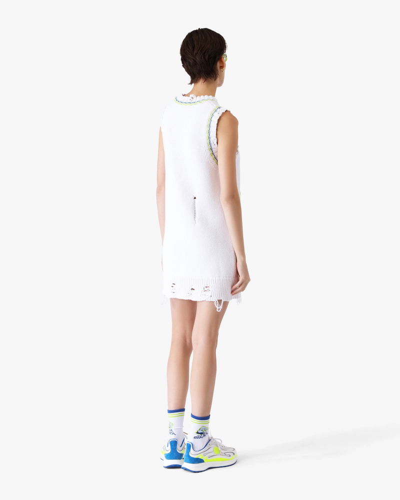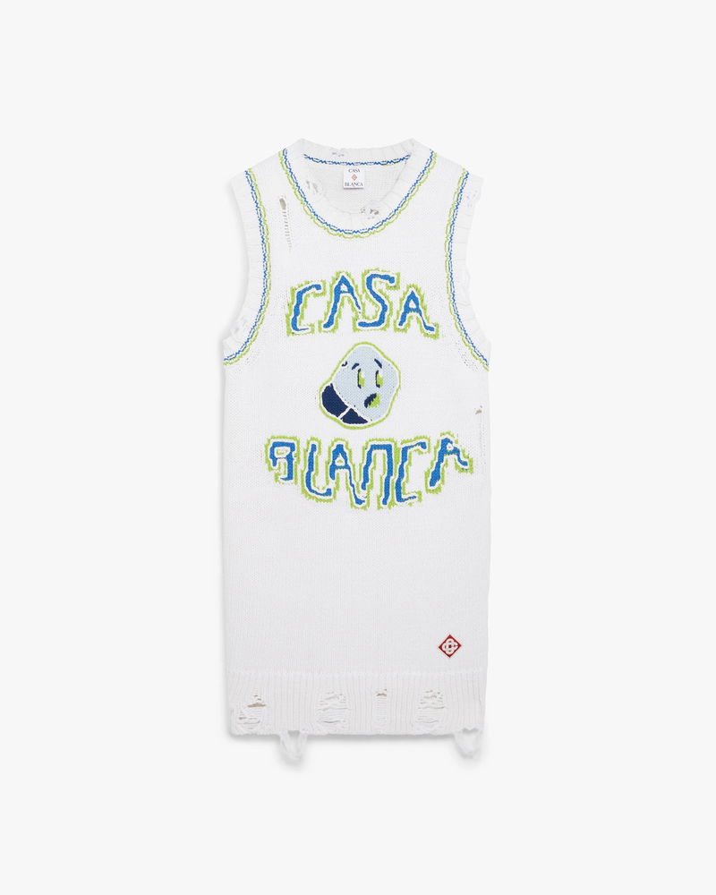 The white hand-knitted mini tank dress is a refined design featuring design elements for the new season including interpretations of the Casablanca logo, and the smiley face on the front. Completed with distressed detailing, a scoop neck, the house's signature diamond logo, and a sleeveless tank silhouette.