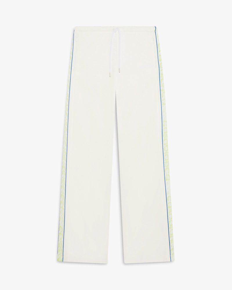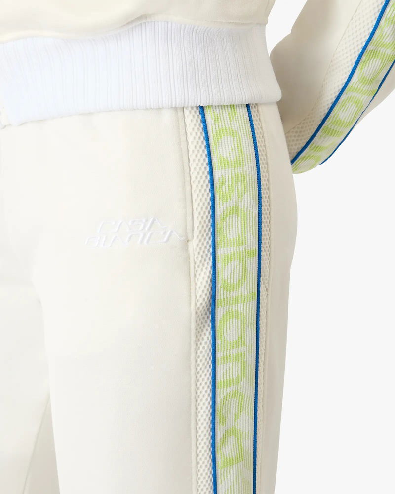 The white Laurel track pants are a straight-leg design featuring the house's signature Casablanca logo. Completed with an elasticised waistband, drawstring fastening, in-seam side pockets, Laurel tape artwork detail down the sides, and a relaxed silhouette. Designed to be worn with the coordinating track jacket. Shiny tricot fabric.