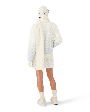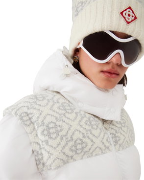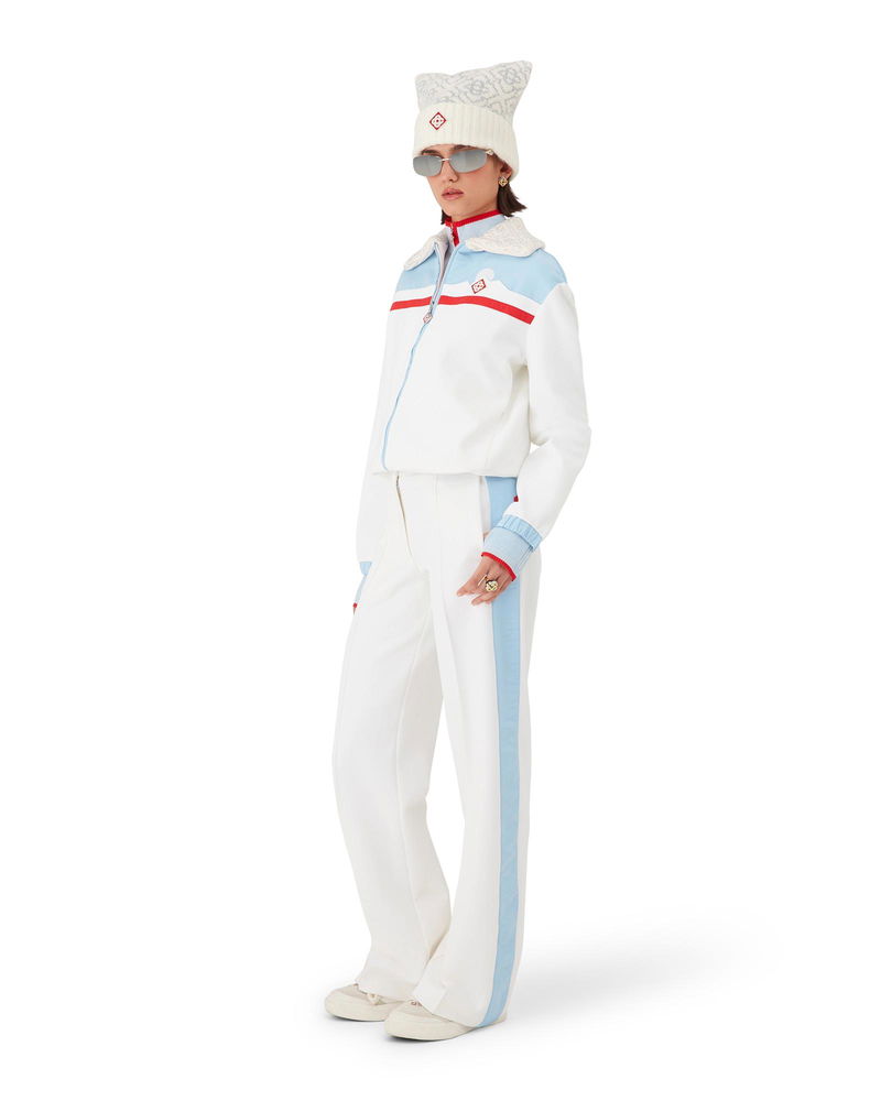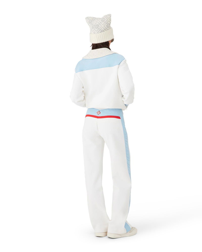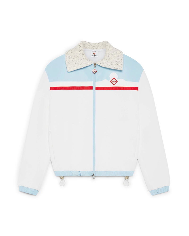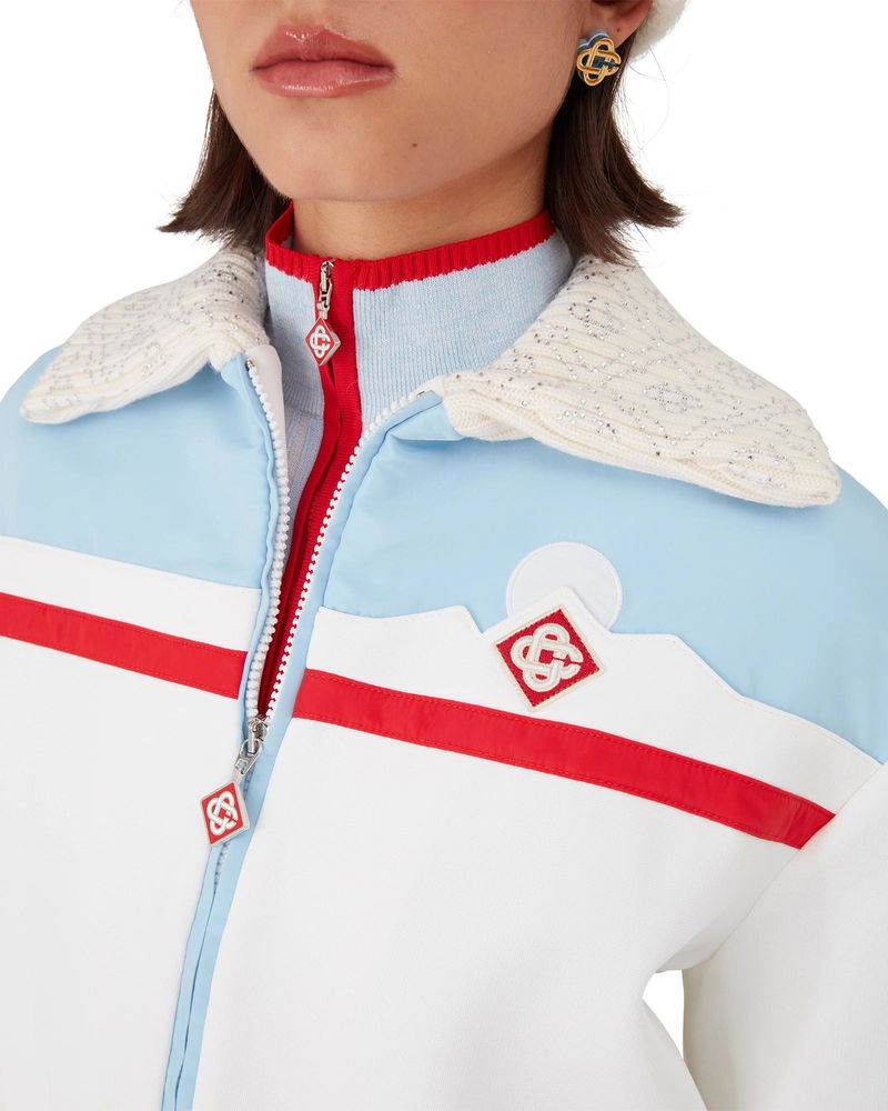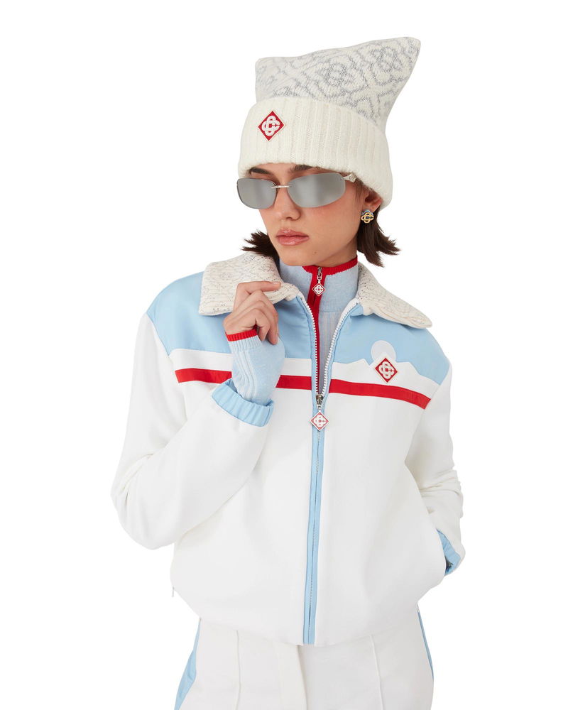 The hybrid ski track jacket is a refined après-sport design crafted from technical dry fabric in white, inspired by crystalline purity of Japan's alpine countryside.