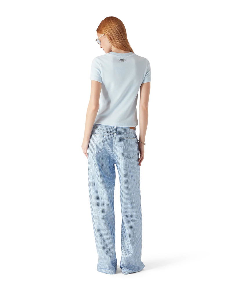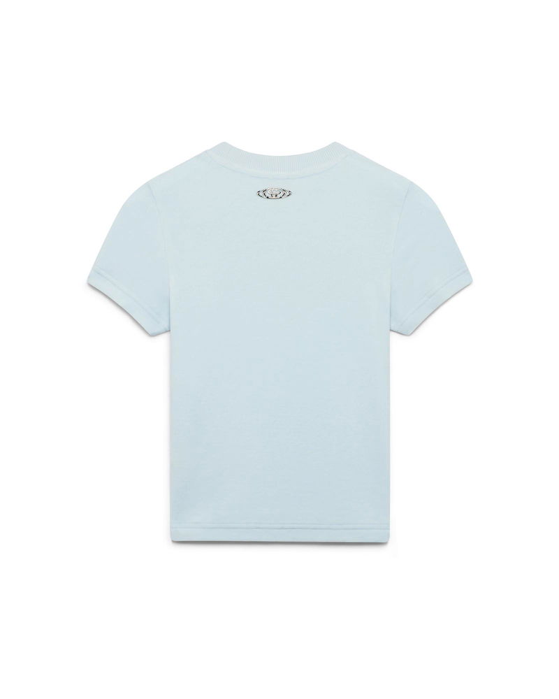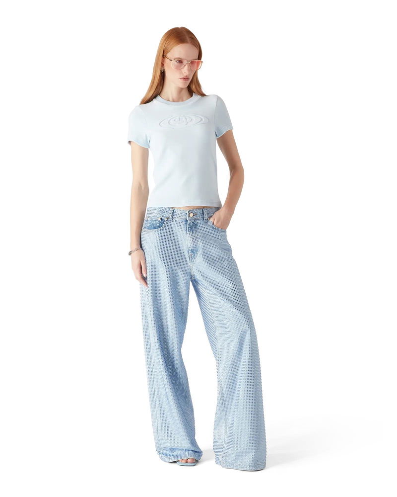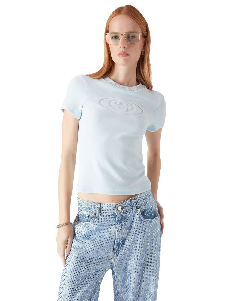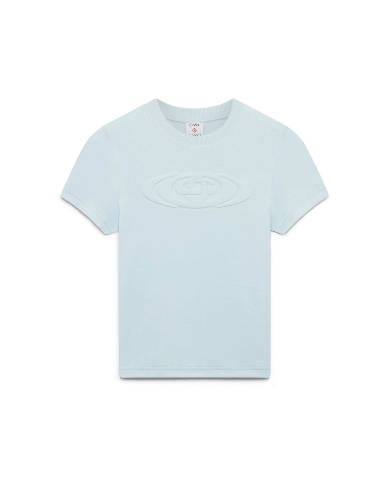 The velour short-sleeve t-shirt is a classic design featuring the house's warped logo embossed at its centre.
