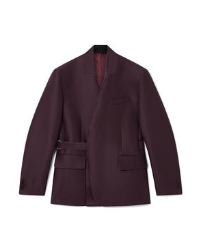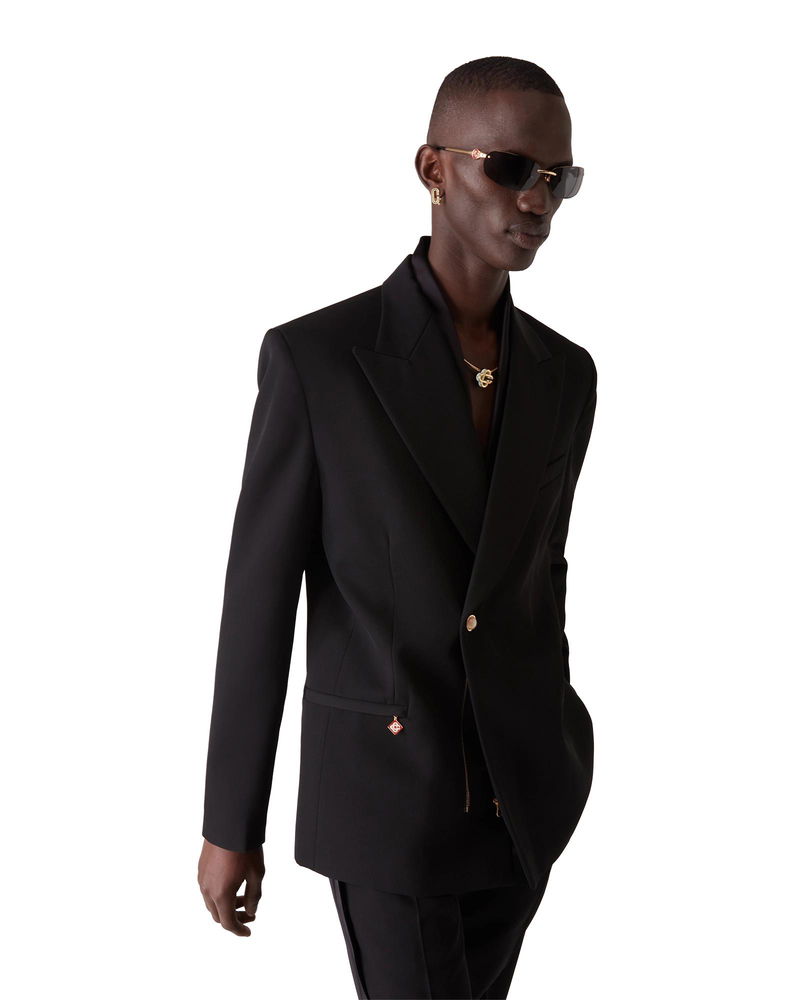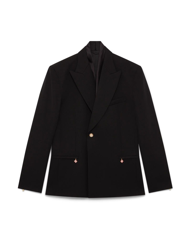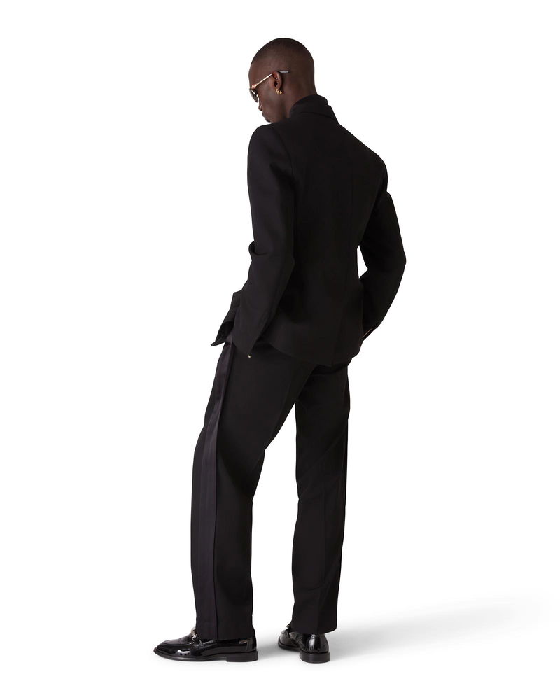 The wool double-breasted jacket is a tailored design crafted from wool fabric. Completed with peak lapels, an inner satin shawl collar detail, a zip and signature gold rim pearl button closure, zip cuffs, welt pockets with zip closure, a breast pocket, internal pockets, and a vent.