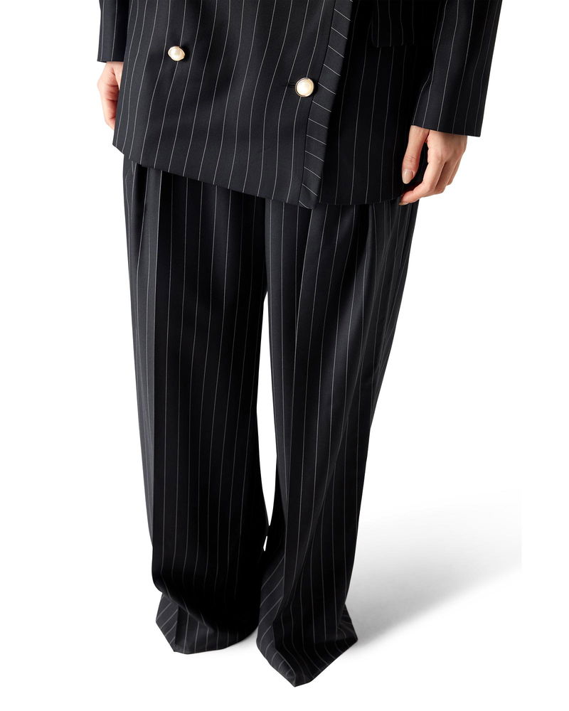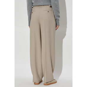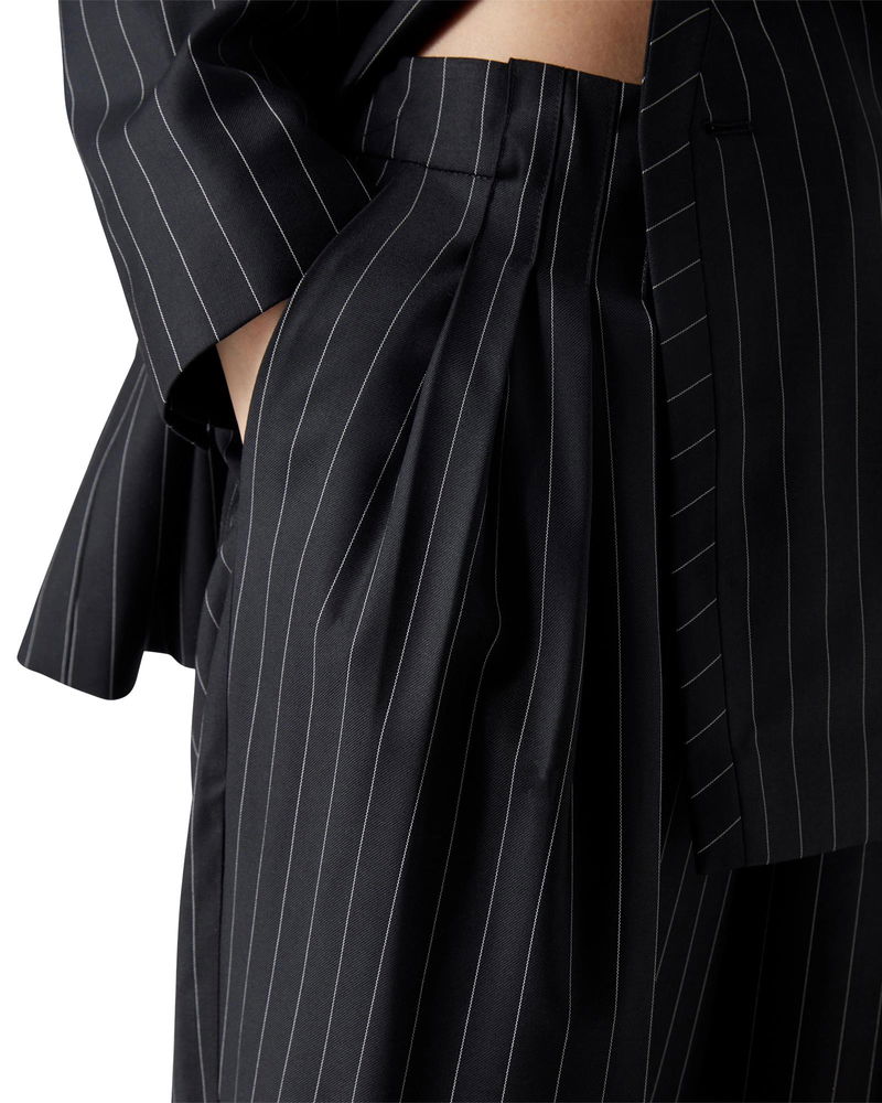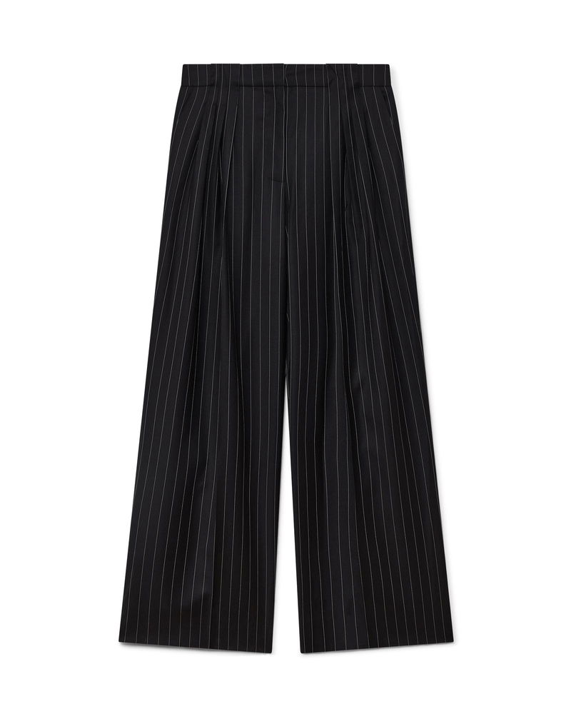 The wool pinstripe triple pleat tailored trousers are a straight-leg design crafted from wool fabric. Completed with a waistband, belt loops, three pleats, slanted front pockets, and welt back pockets with flat shank CC button closure.