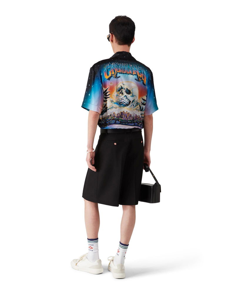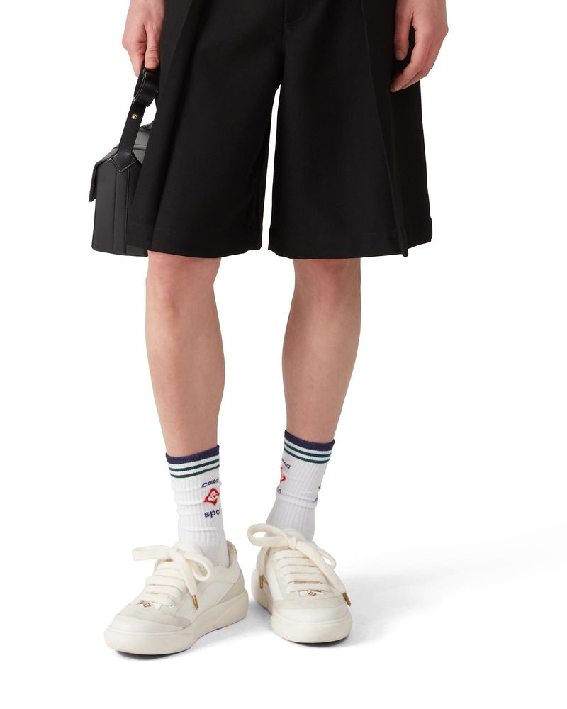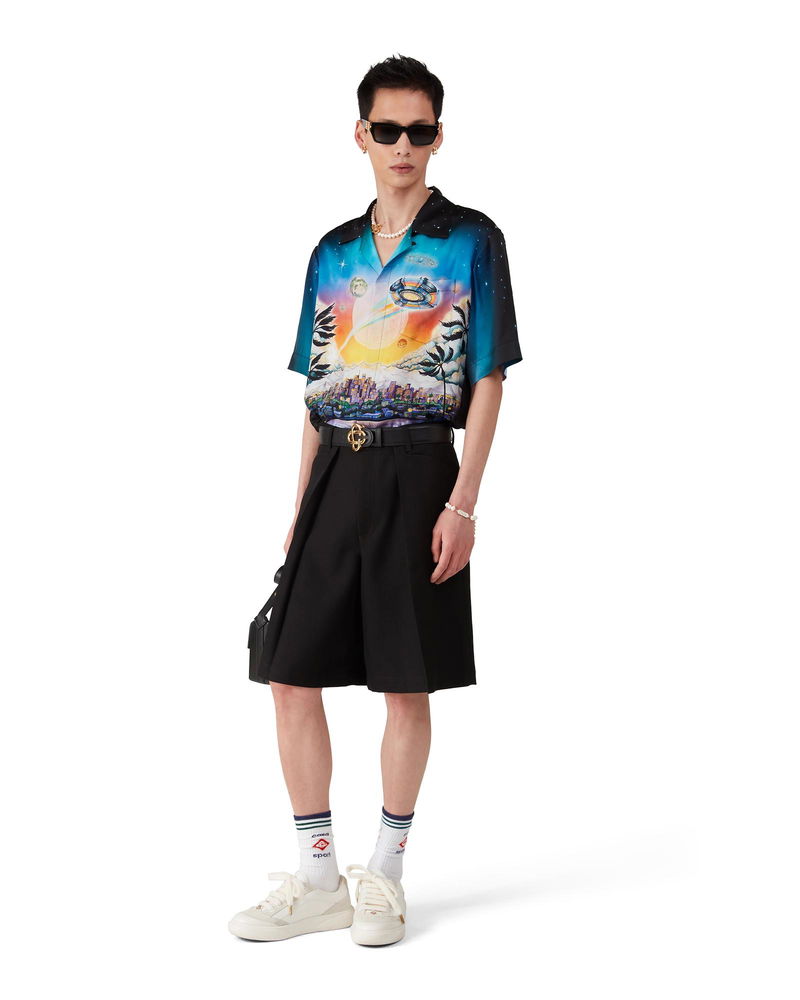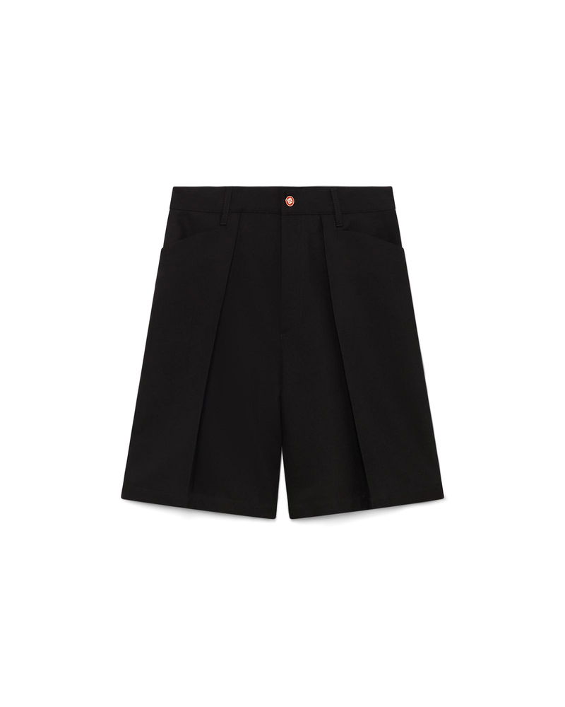The wool pleated tailored shorts are a relaxed design crafted from wool fabric and feature a cotton blend lining. Completed with belt loops, pleats, a zip closure, front pockets, and welt back pockets with interlocking CC logo gold rim enamel button closure - designed for a relaxed fit. Wool fabric Main: 100% wool Lining: 52% viscose 48% cotton Colour: black Specialised dry clean only Made in Portugal Wool Pleated Tailored Shorts, Size 44 by Casablanca Paris