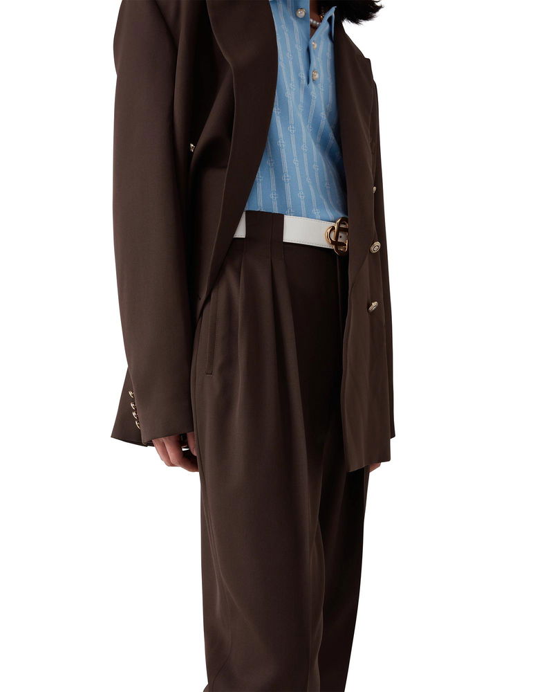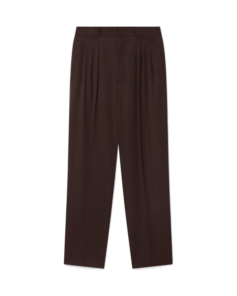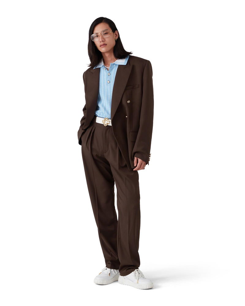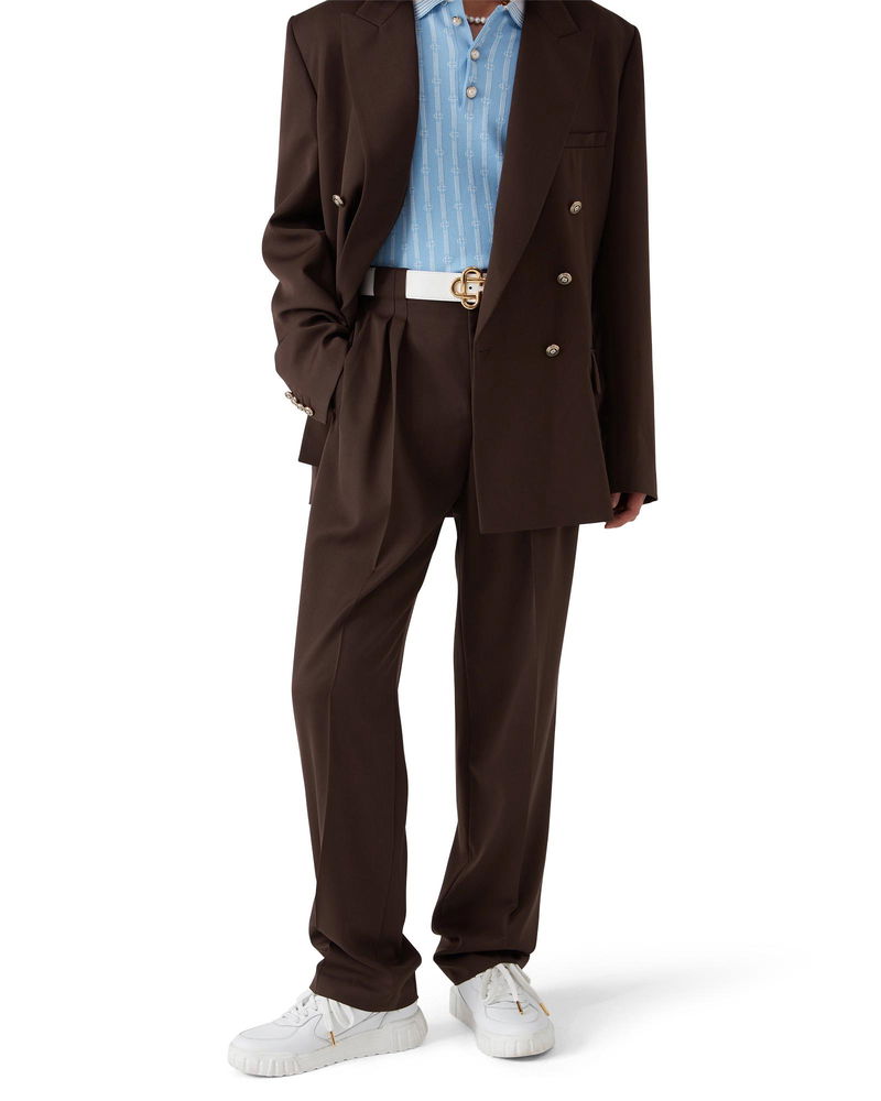 The wool pleated tailored trousers are a tapered leg design crafted from virgin wool and feature a cotton blend lining. Completed with a zip closure, five pleats at the front, slanted front pockets, welt back pockets with a small box pleat, and wide belt loops. Wool fabric Main: 100% virgin wool Lining: 52% viscose 48% cotton Colour: brown Specialised dry clean only Made in Portugal The model is 187cm/6'1 and is wearing a size M Wool Pleated Tailored Trousers, Size 46 by Casablanca Paris