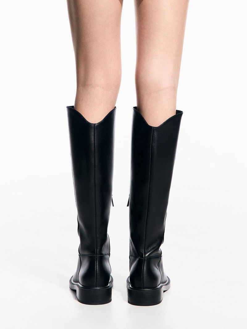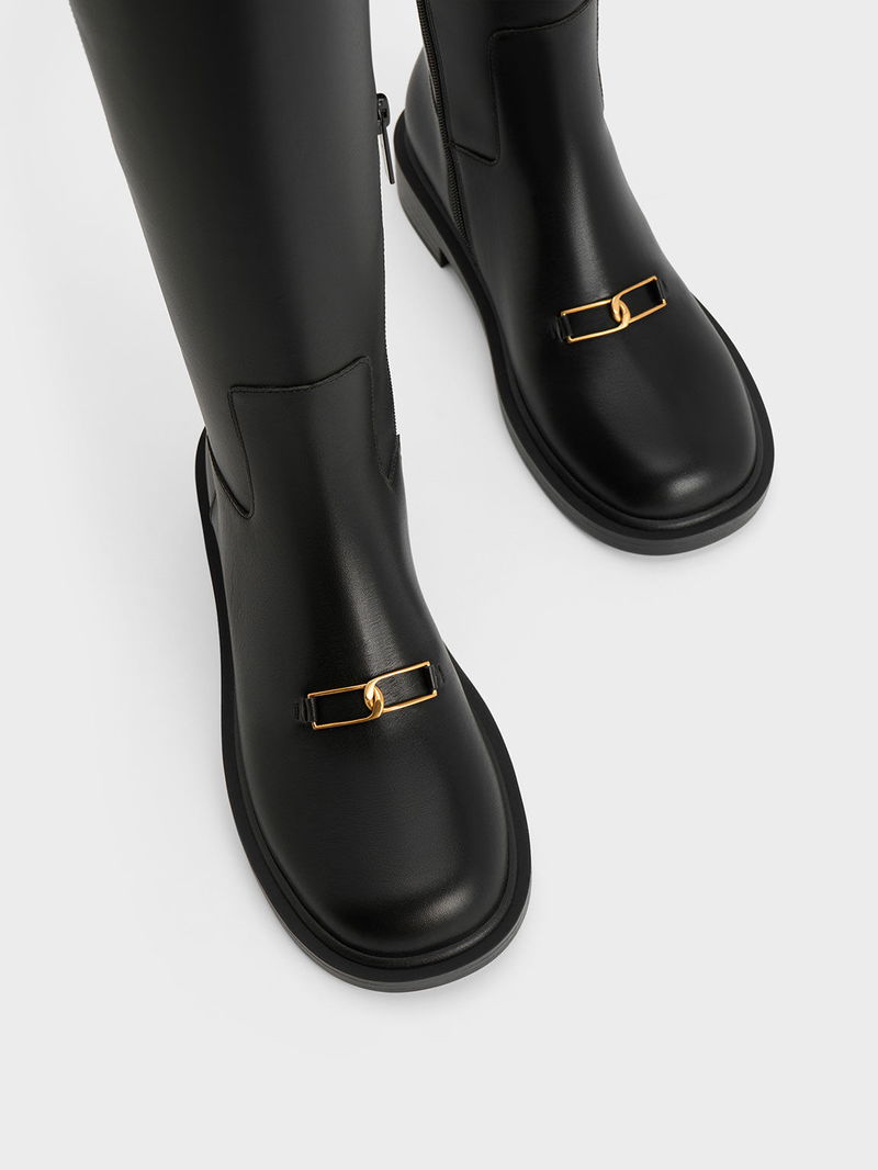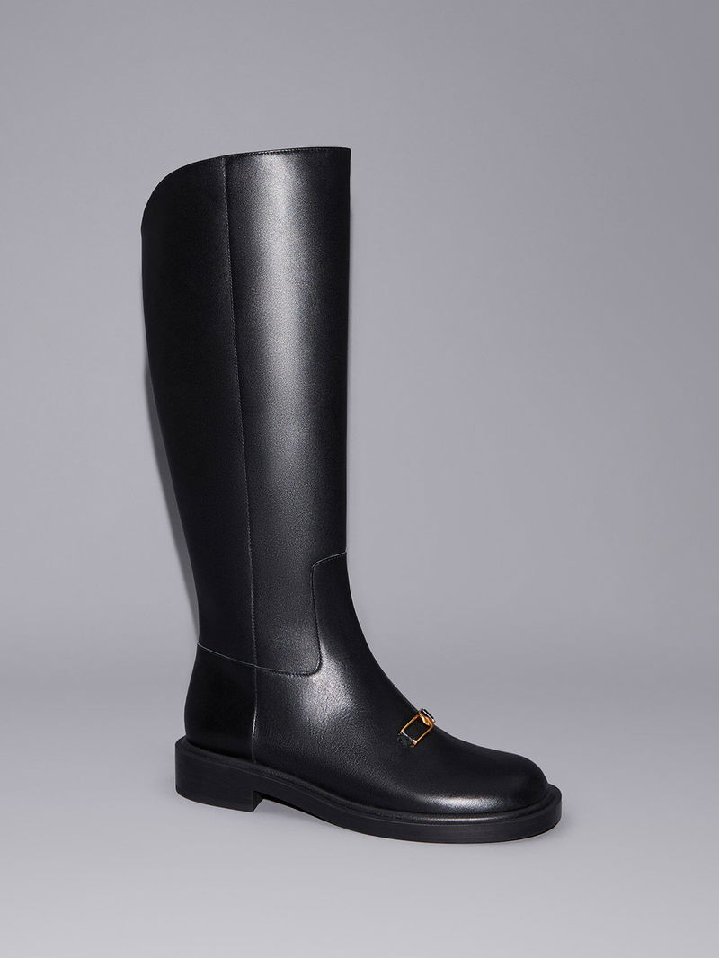 The latest addition to our Gabine family comes in the form of these knee-high boots that will instantly upgrade your winter style. Keeping the design sleek and streamlined, except for the subtly curved top edges, the focal point of these shoes are undoubtedly the interlocking U-shaped buckles that gleam gold against the matte black finish of the boots. Made from genuine leather for a luxurious look and feel, they are definitely an investment piece made to stand the test of time.