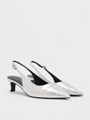 Perforated Rose Pointed-Toe Kitten-Heel Slingback Pumps