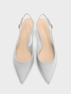 These slingback pumps in silver are made with satin and feature dangling teardrop crystals, pointed toes and stiletto heels. Pair them with a silver bag and silver jewellery for a coordinated evening ensemble that is equal parts chic and contemporary.
