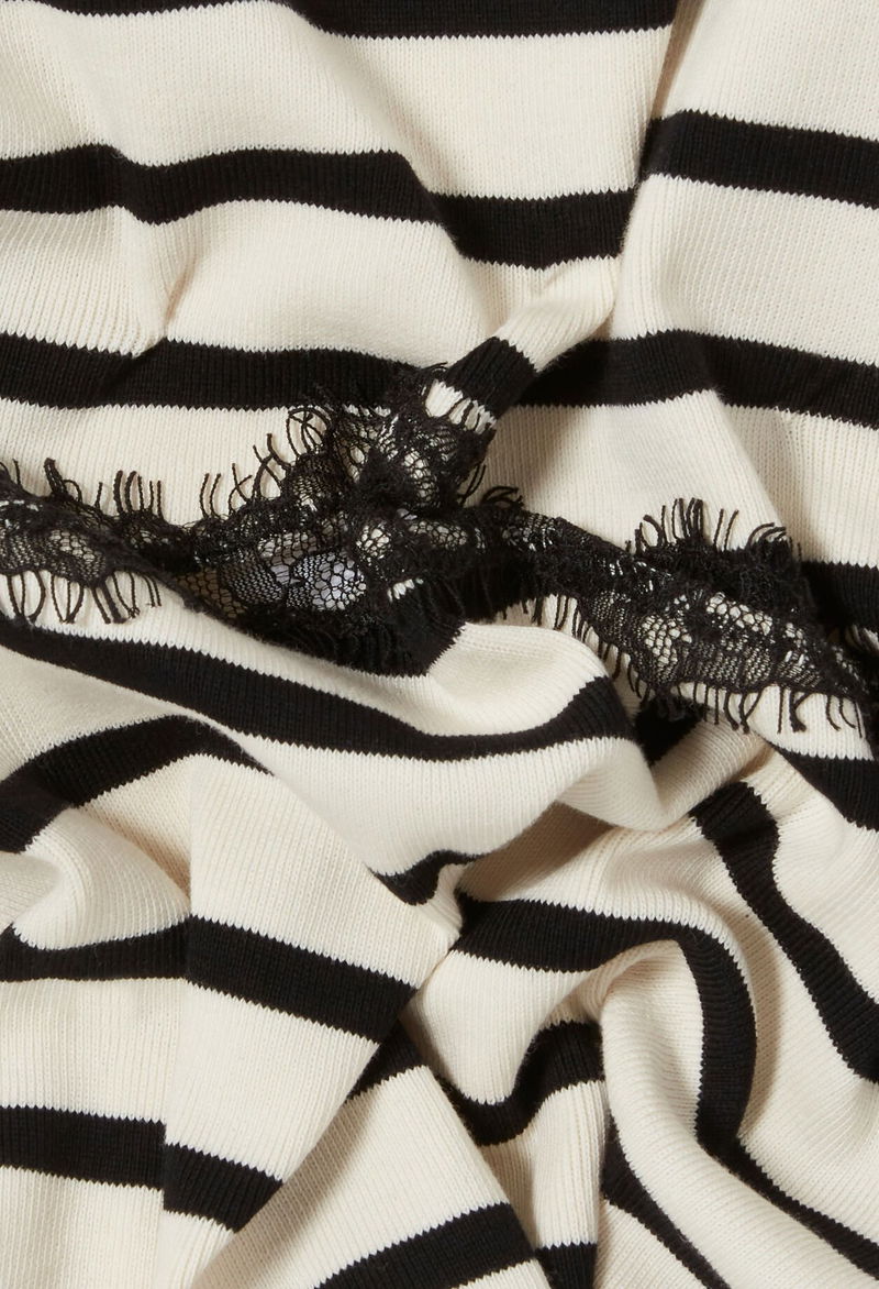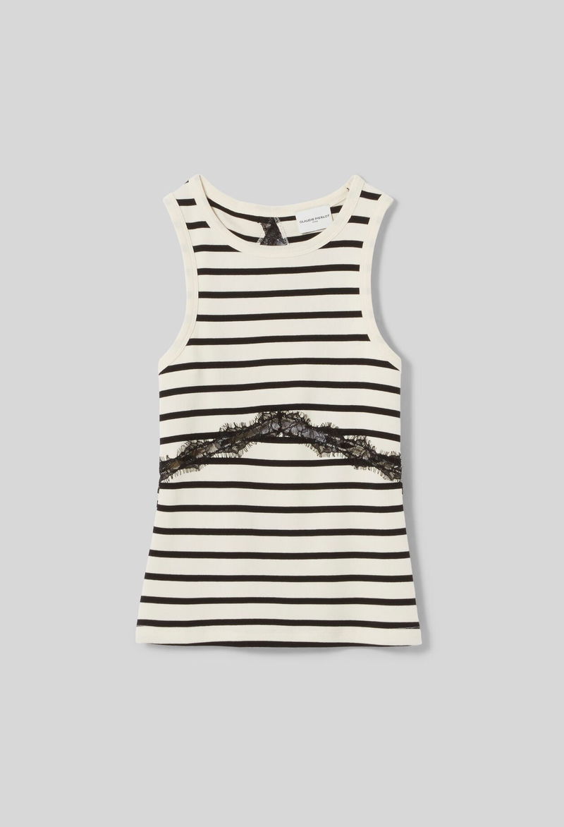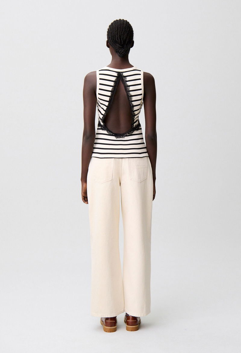 Sleeveless cotton Breton stripe t-shirt with a round neck, featuring a lace panel under the bust and a lace-trimmed open back