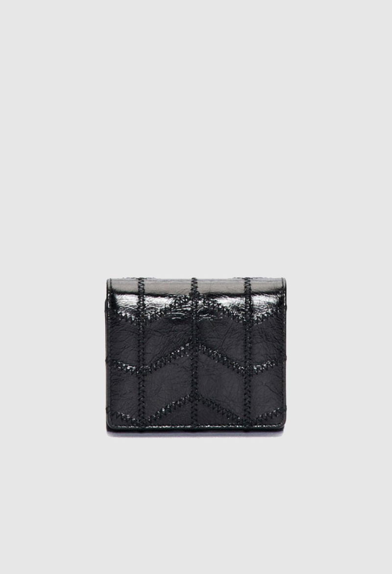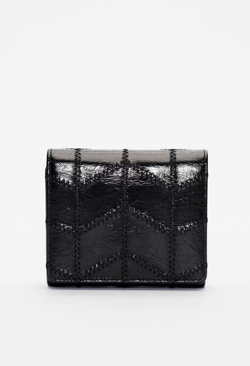 Embroidered patent leather purse, 3 compartments and 1 coin pocket, 6 card slots. Cowhide with cotton lining