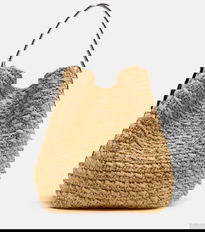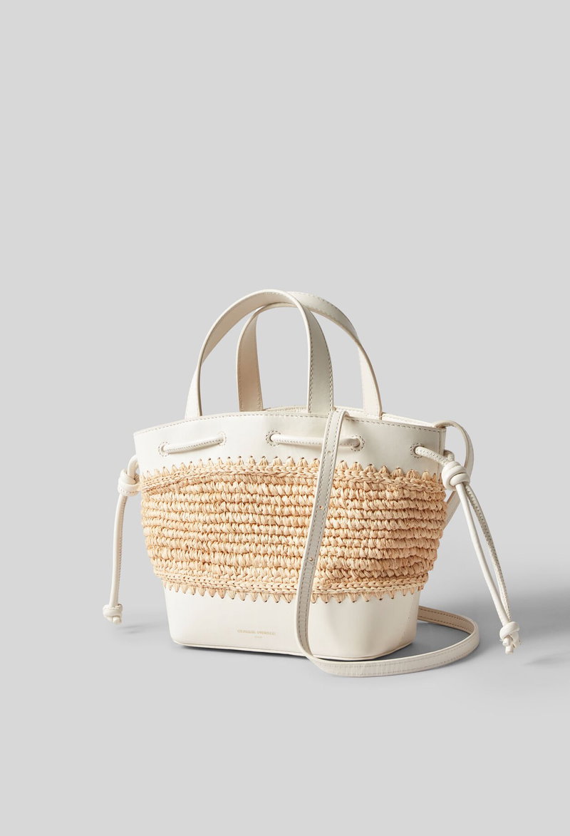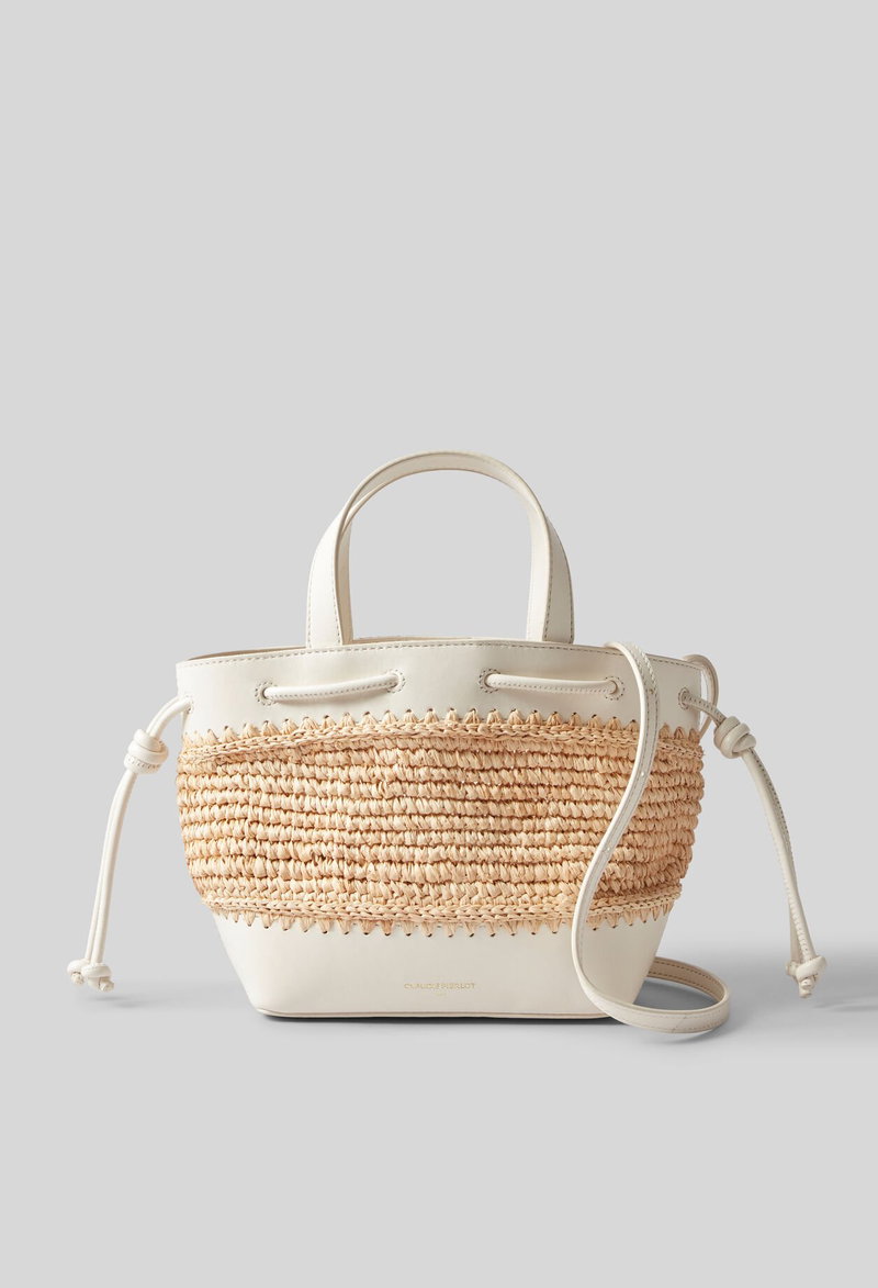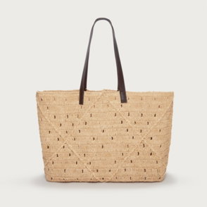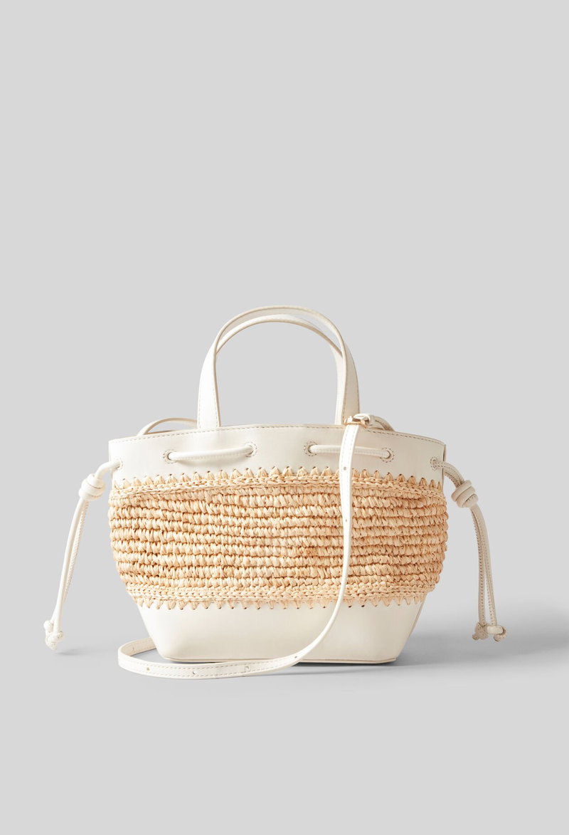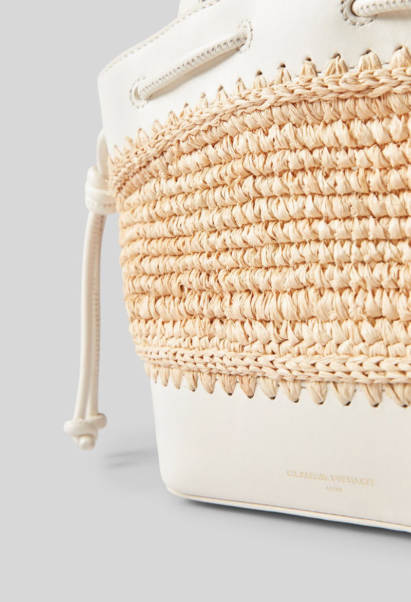 Dual-material basket in woven raffia and smooth leather, for hand or shoulder carry.