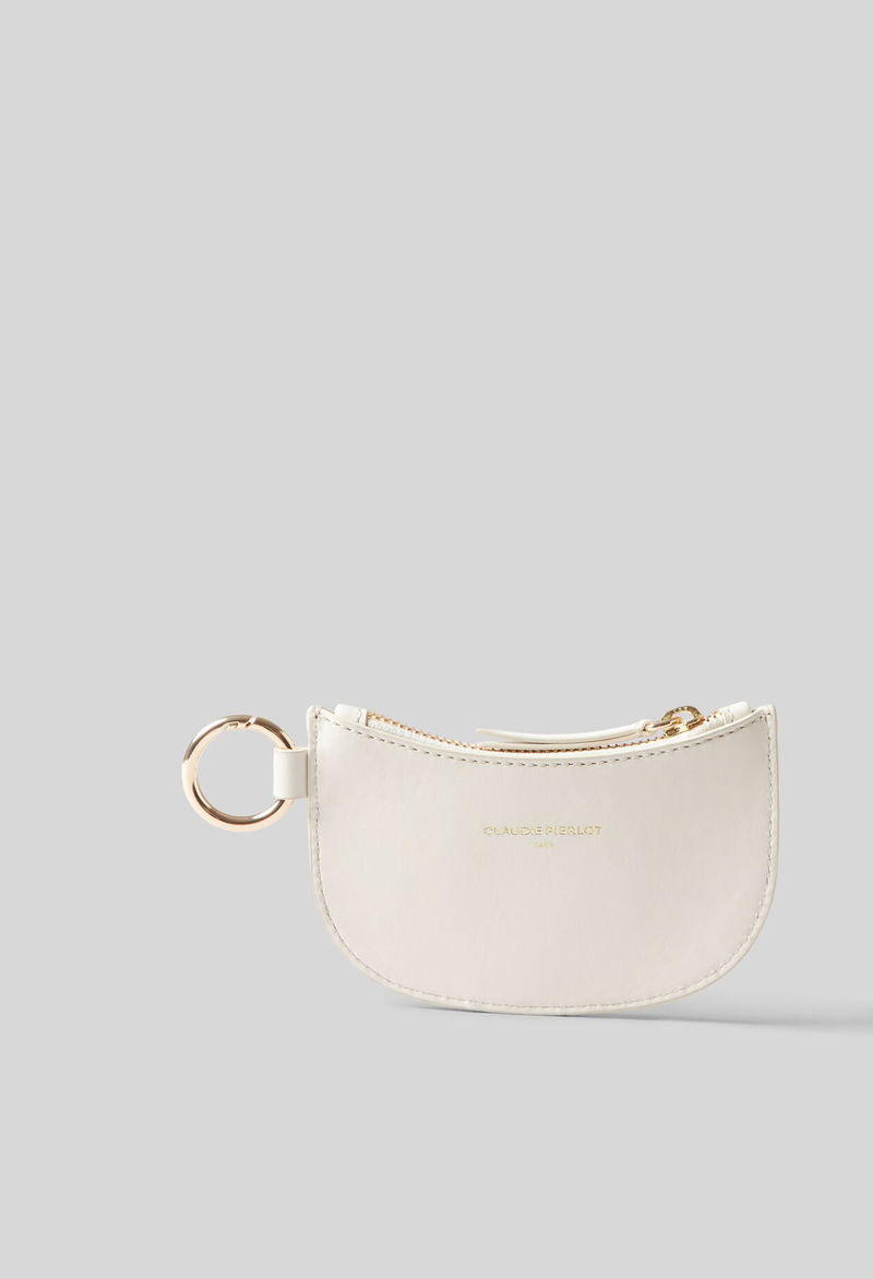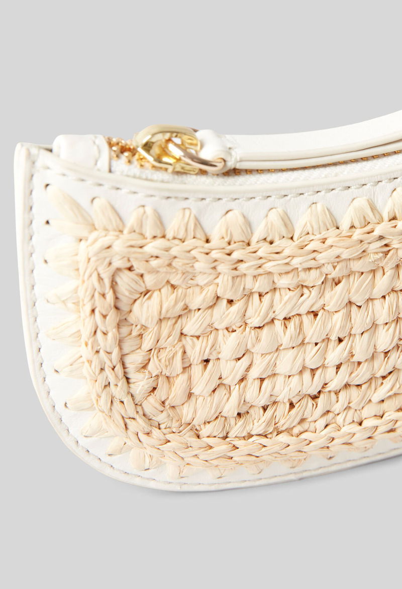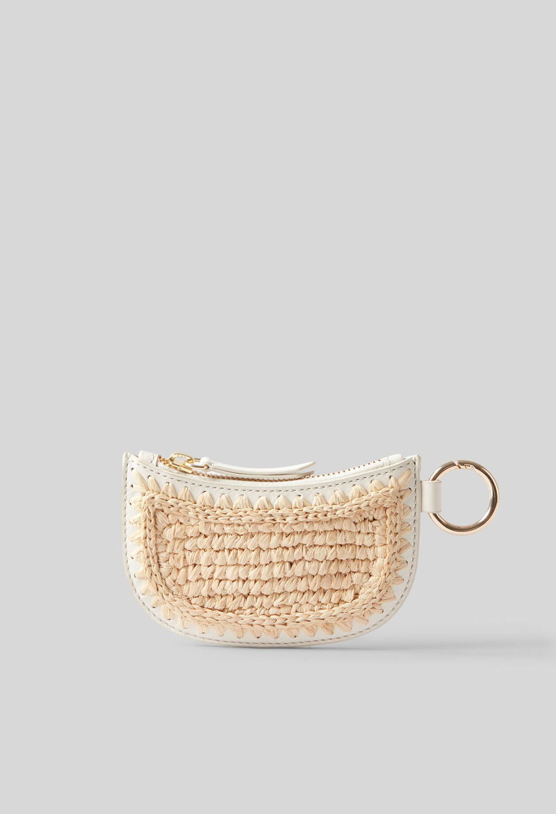 Zipped leather and natural raffia coin purse with round carabiner clip