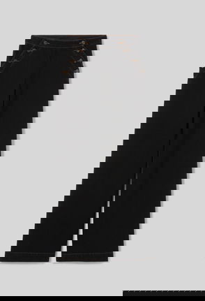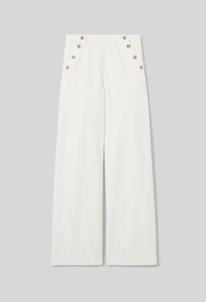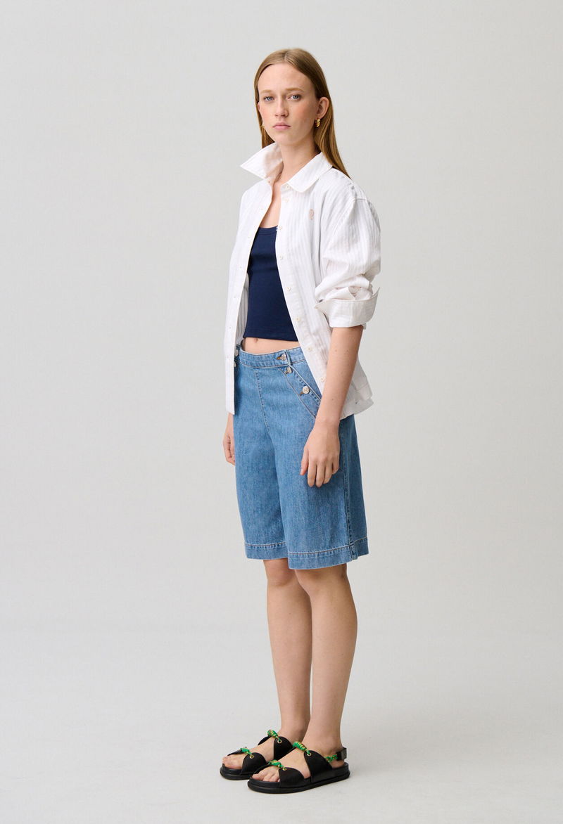 Wide-leg sailor-style denim shorts.