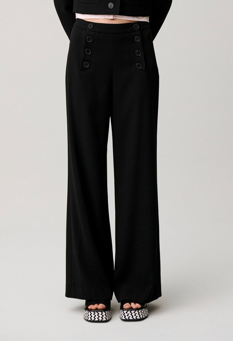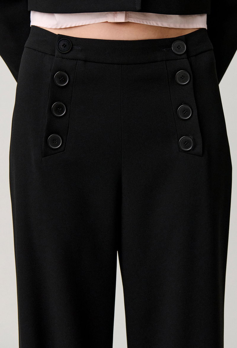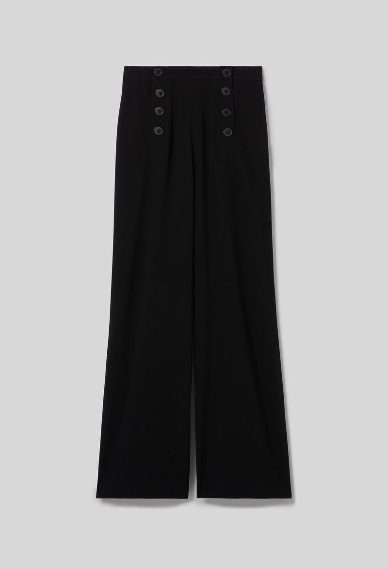 Button-front sailor trousers with long, straight legs.