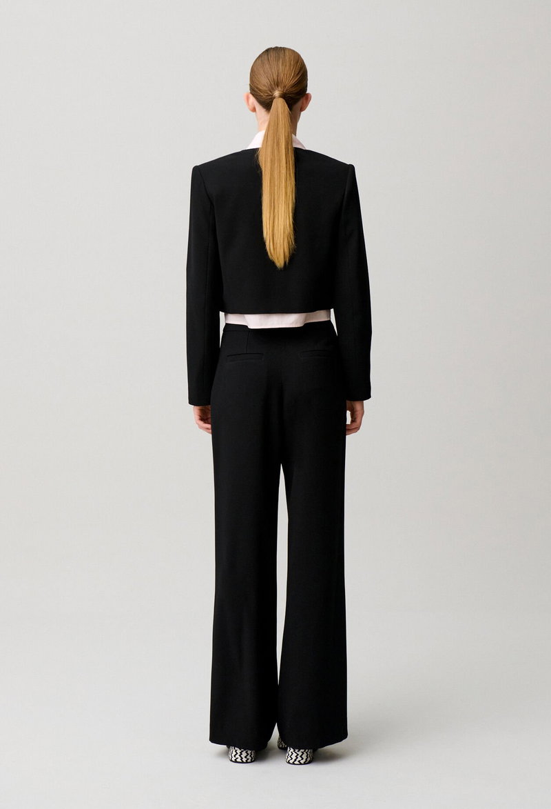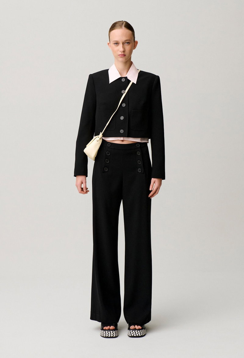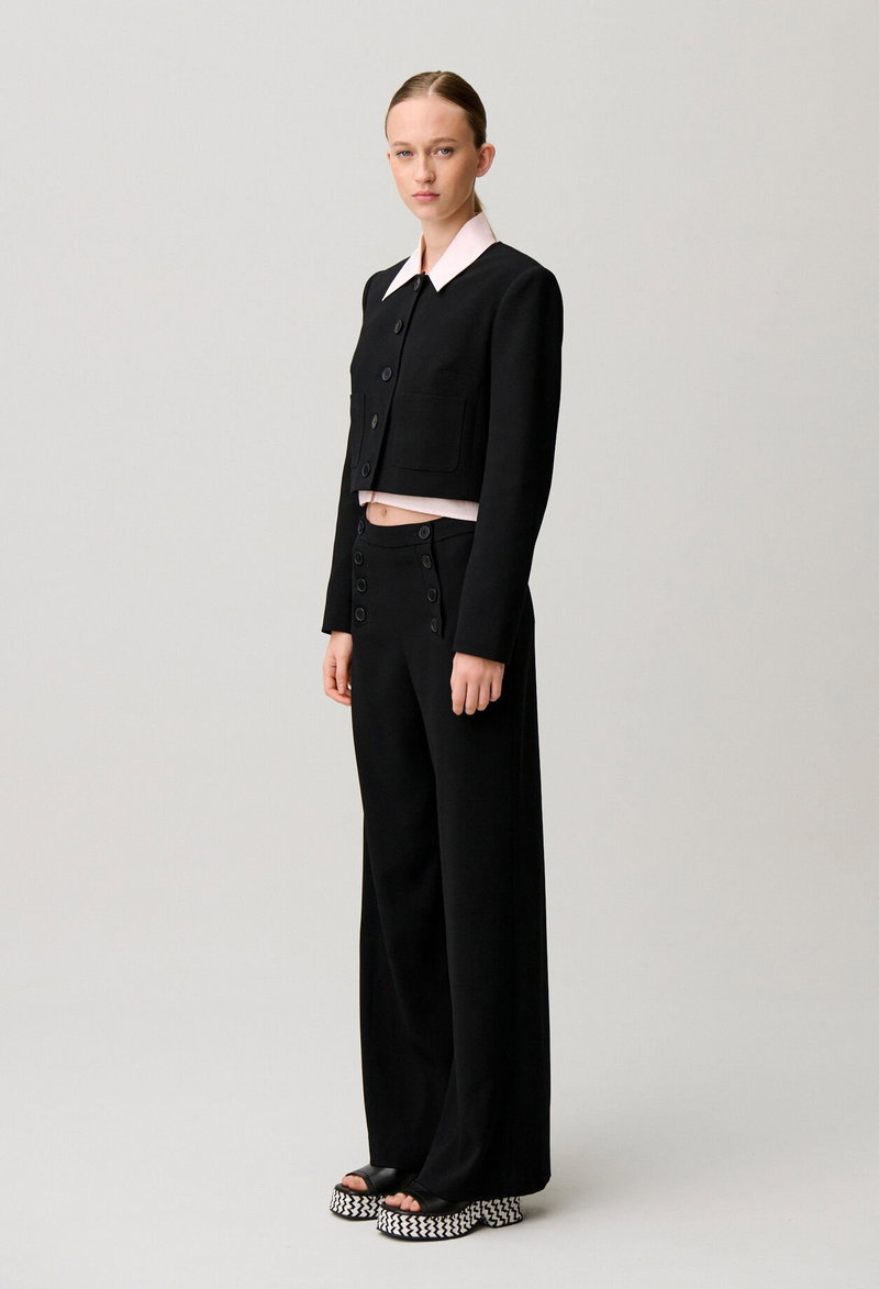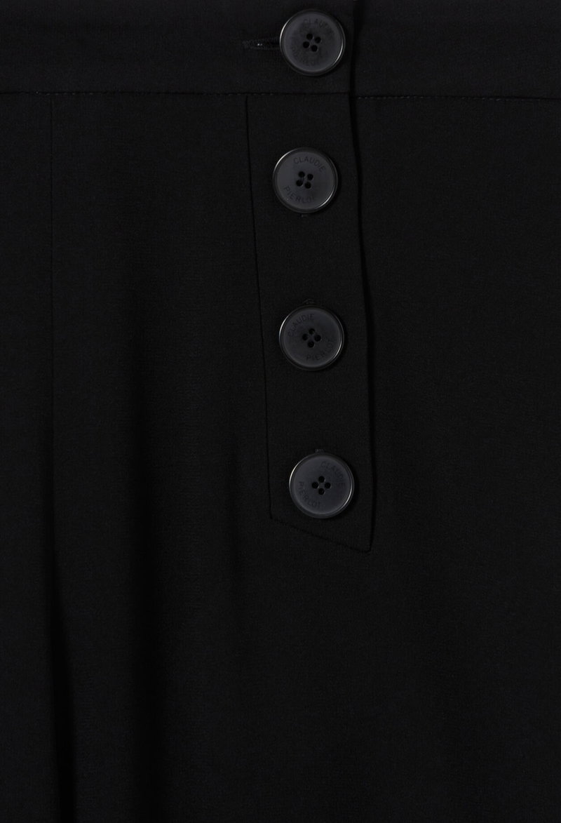 Button-front sailor trousers with long, straight legs.