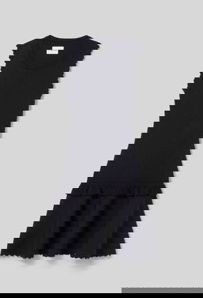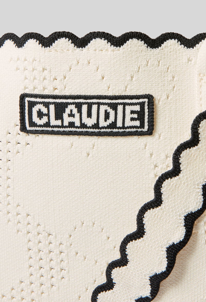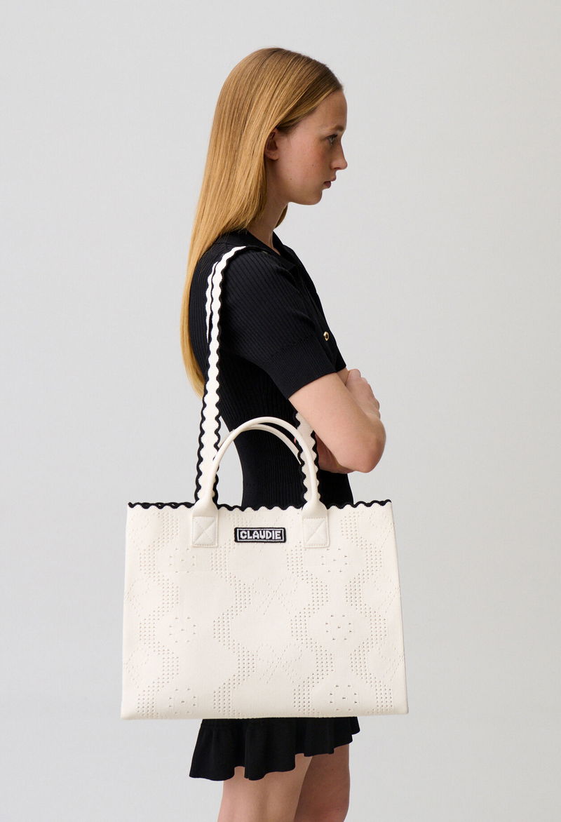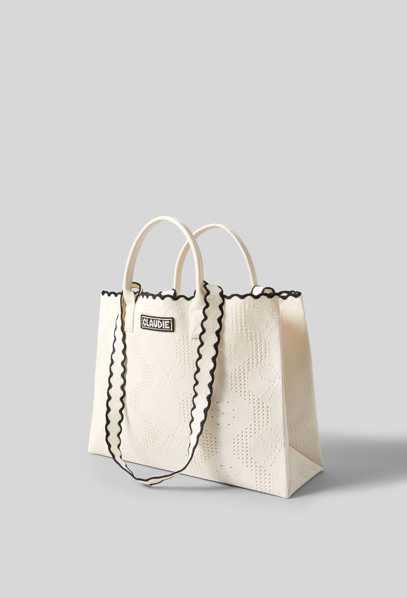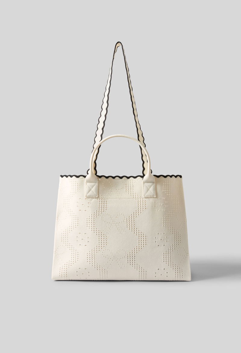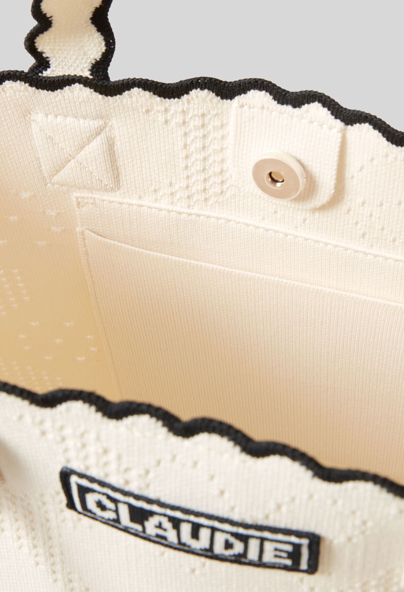 Two-tone ecru and black knitted tote bag.