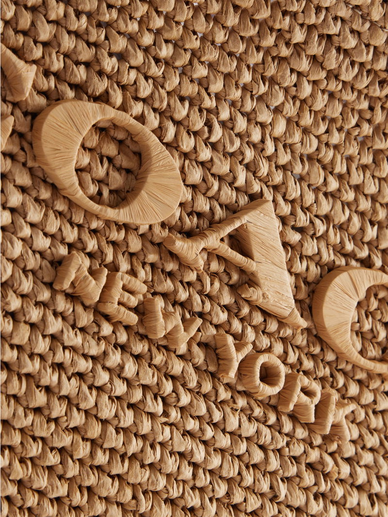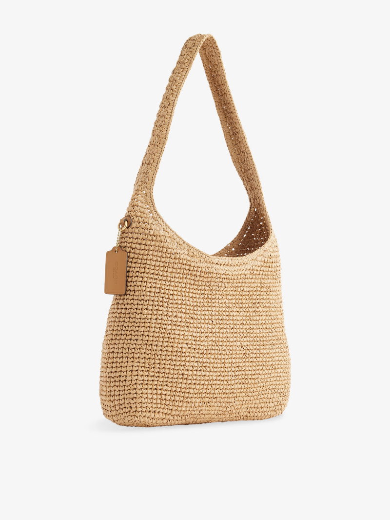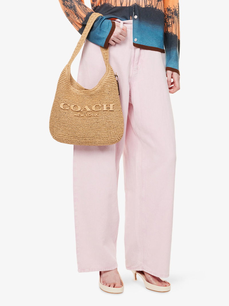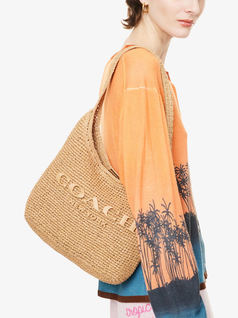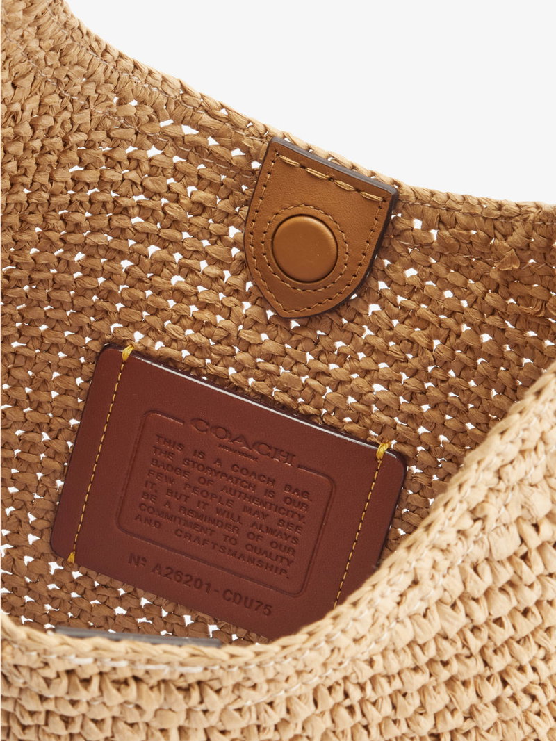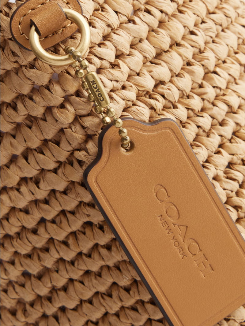 Coach straw shoulder bag. Magnetic fastening. Curved shape, strap, branding to front, one main compartment.