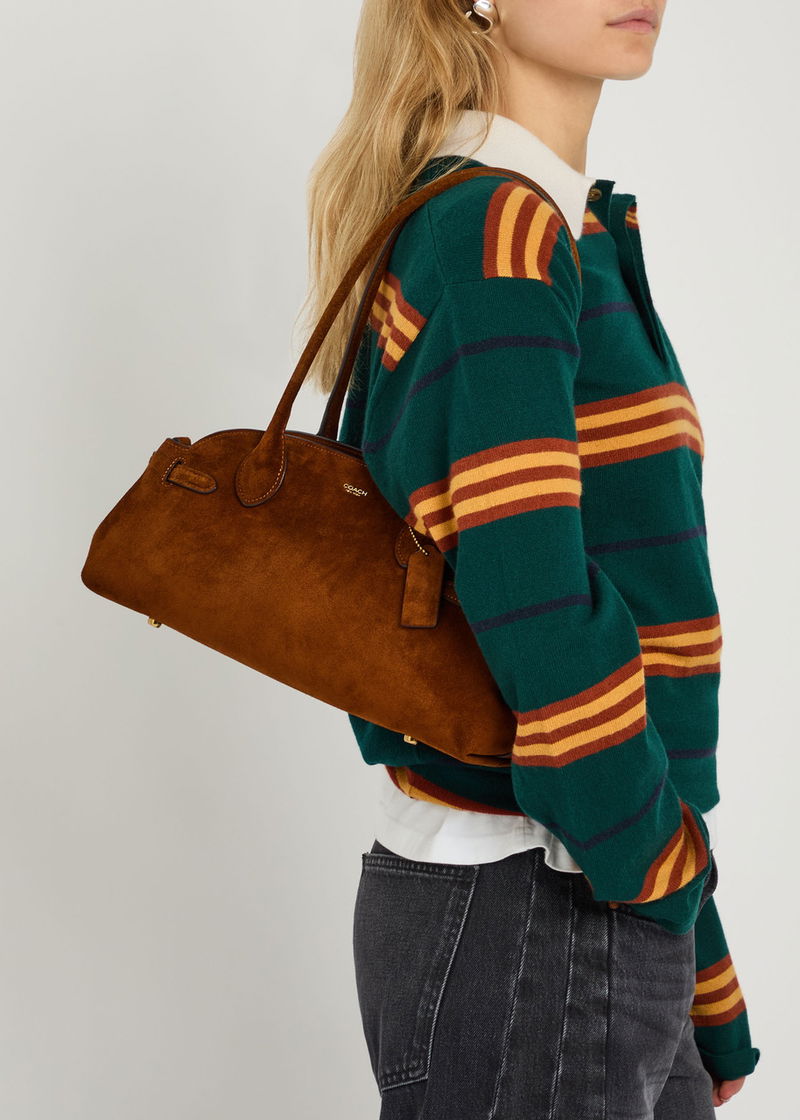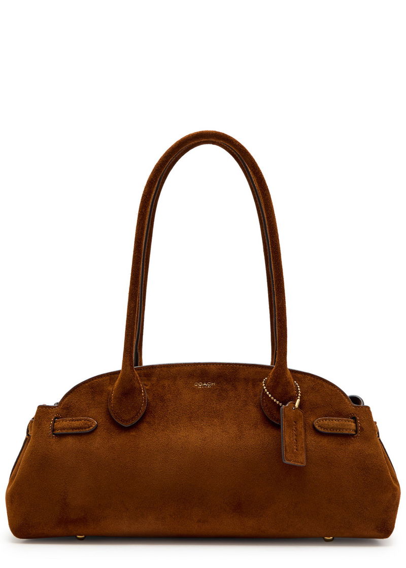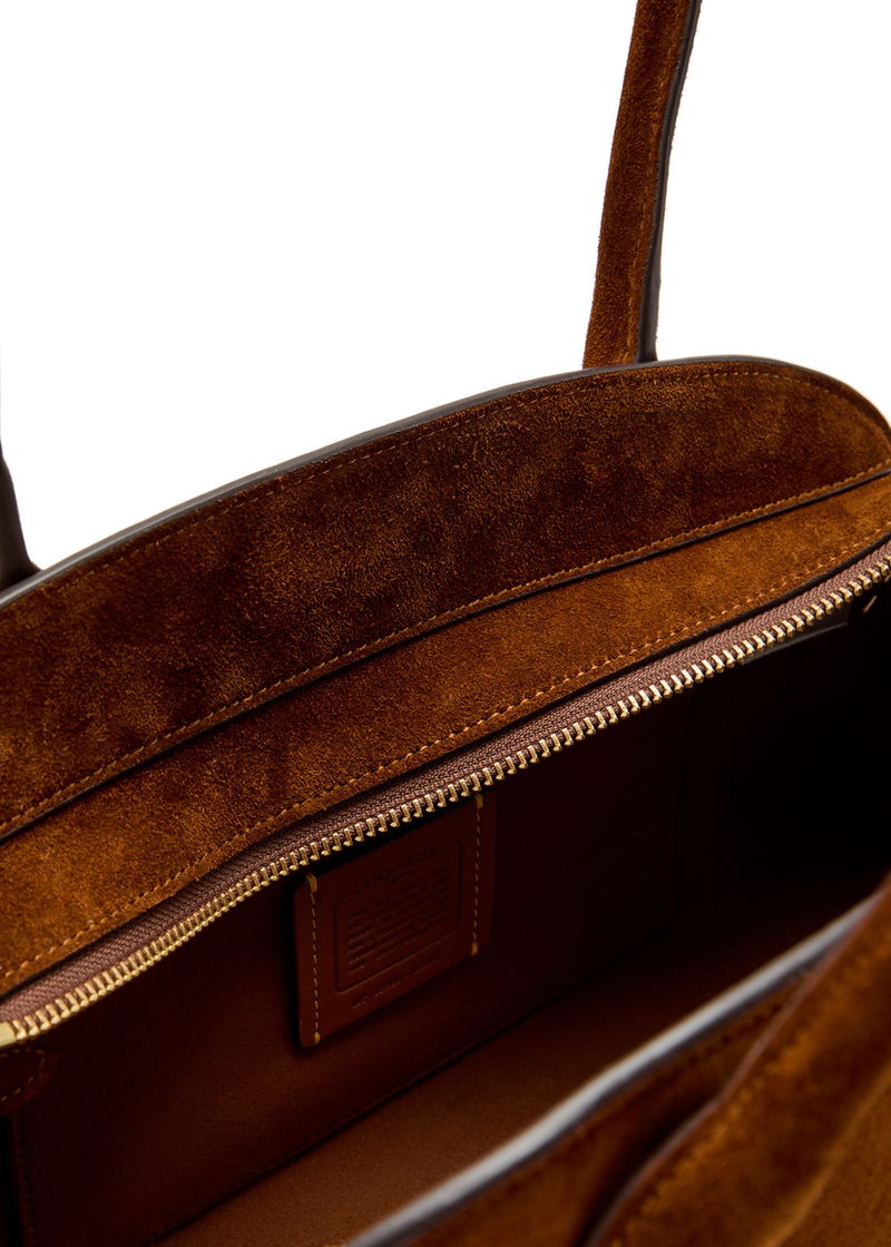 Coach suede shoulder bag. Two shoulder straps, detachable designer tag, metallic designer stamp, adjustable belt strap through sides, feet, internal slip pocket, suede lining. Zip fastening across top.