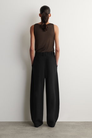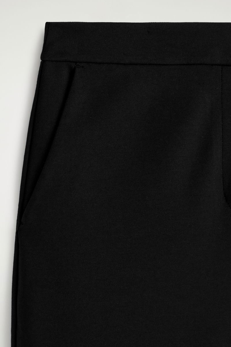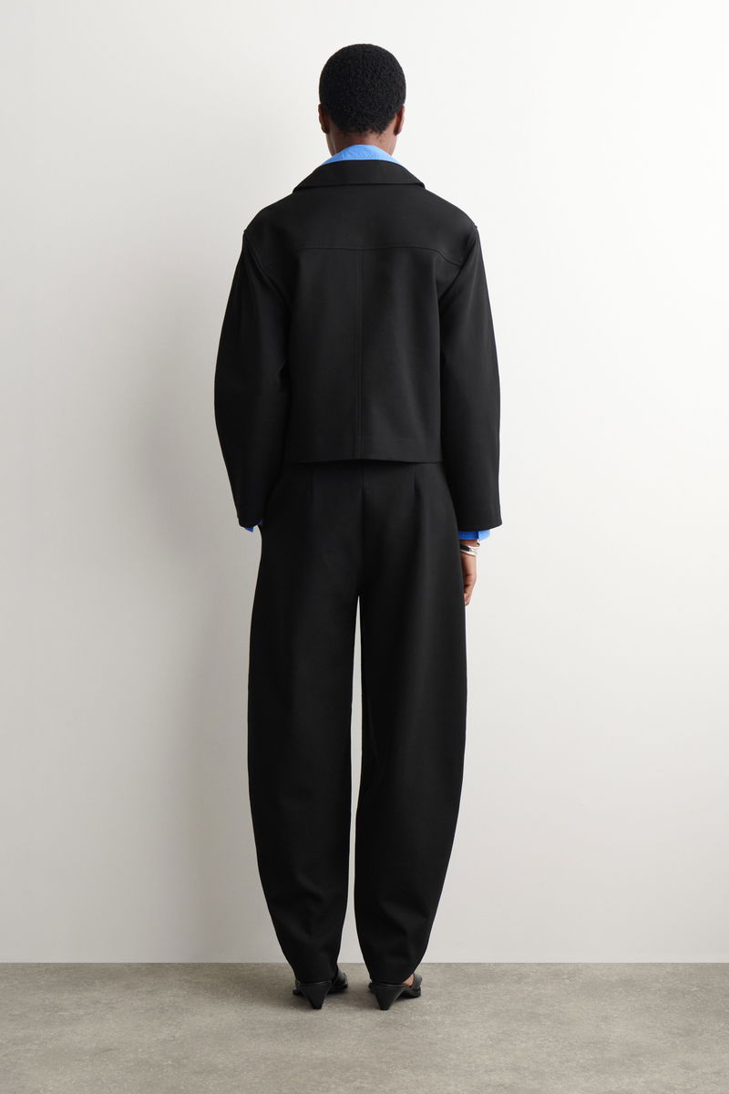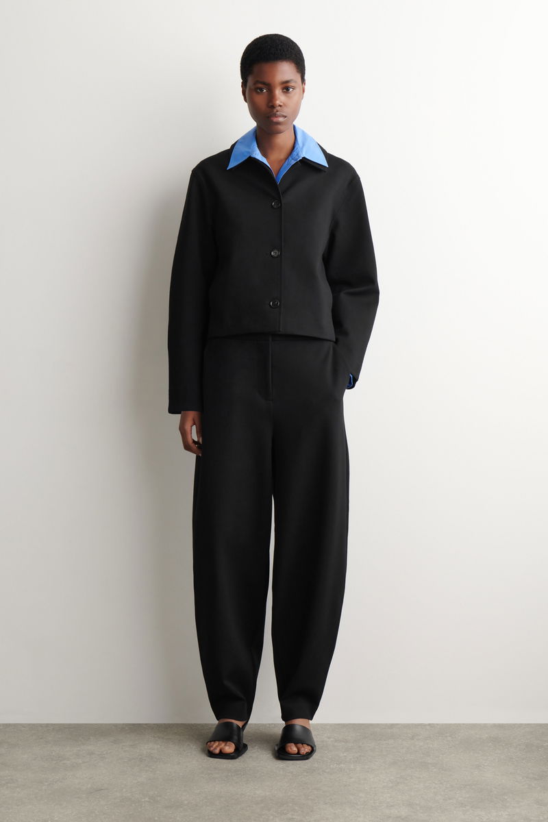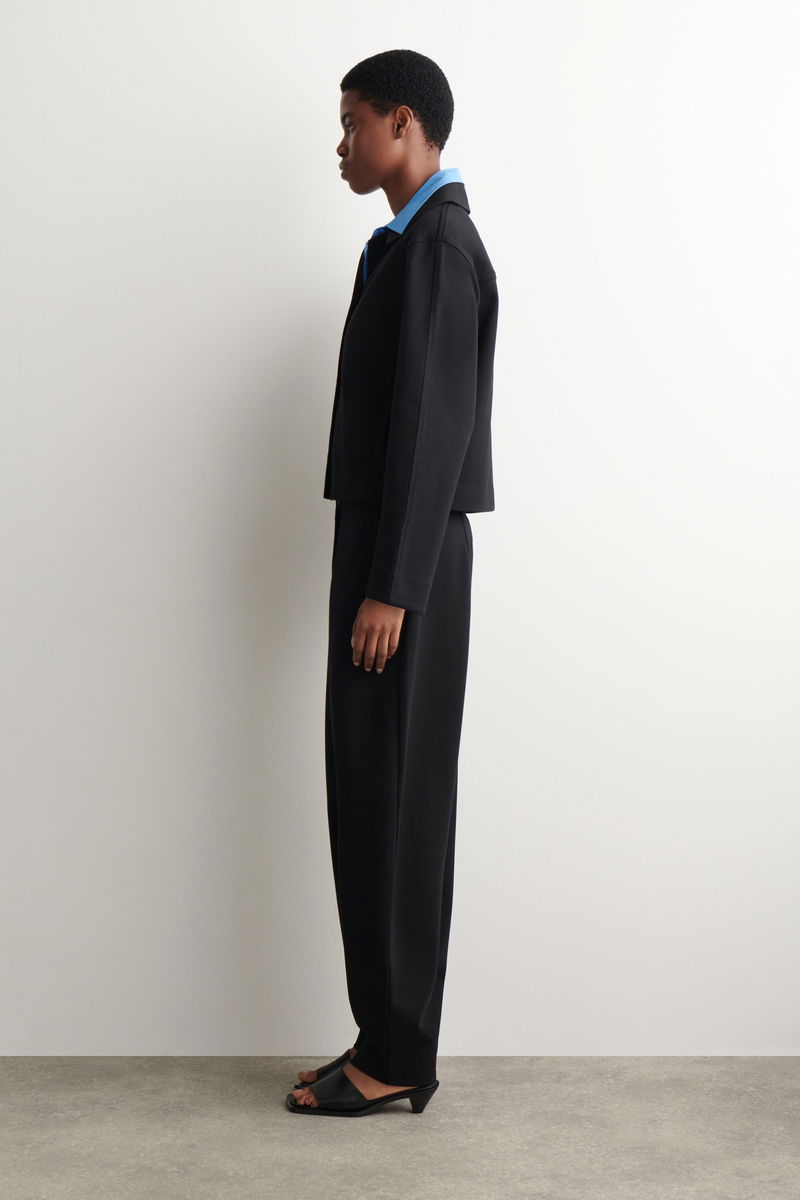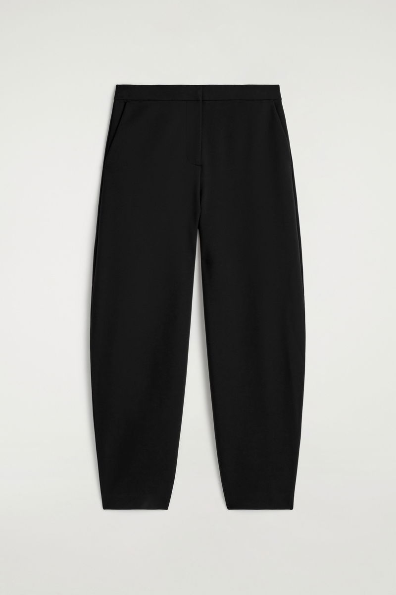 Distinctive in shape, these modern trousers are made from soft cotton-blend jersey with a streamlined finish and rounded tulip legs that taper at the ankle. Style them with the matching jacket for a tonal look.