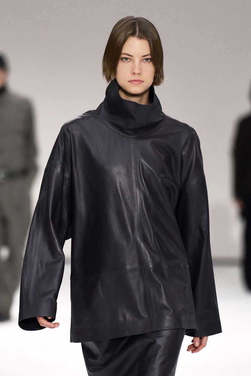 Autumn Winter 2025 takes the modern wardrobe to new heights: the epitome of quiet confidence. Reframing classics with contemporary appeal, this cocooning leather top is made from premium lambskin, selected for its exceptionally supple, butter-soft handle, and rendered in a rich espresso tone. The silver-tone press studs encourage thoughtful styling, while the raw-cut funnel neck is finished with bonded edges.
