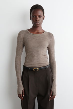 Considered wardrobe foundations are a pillar of the COS womenswear collection. This refined top is crafted from premium 165gsm merino and designed with thumbhole cuffs and a double-layered high neckline. The slim silhouette and featherlight handle encourage thoughtful layering.