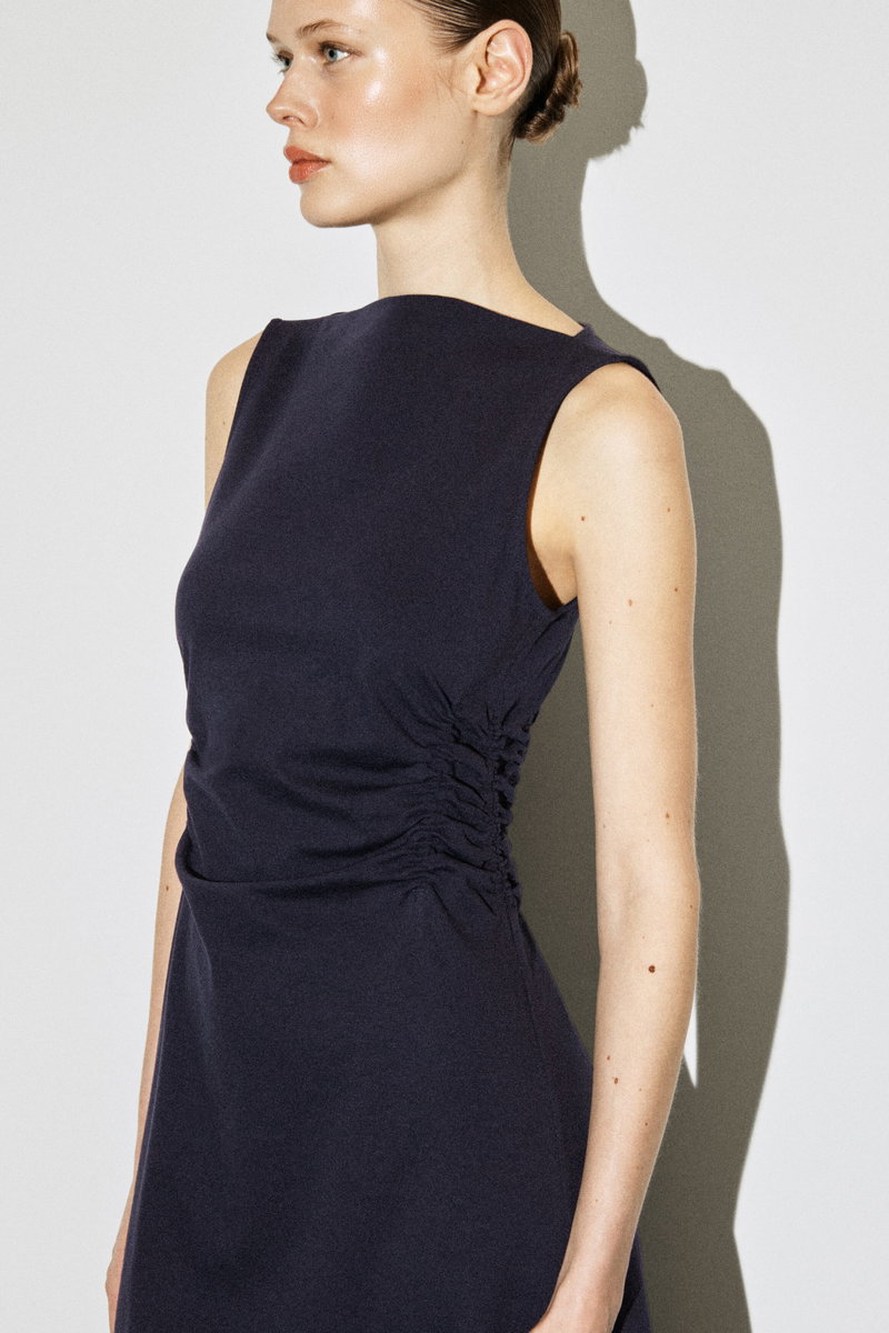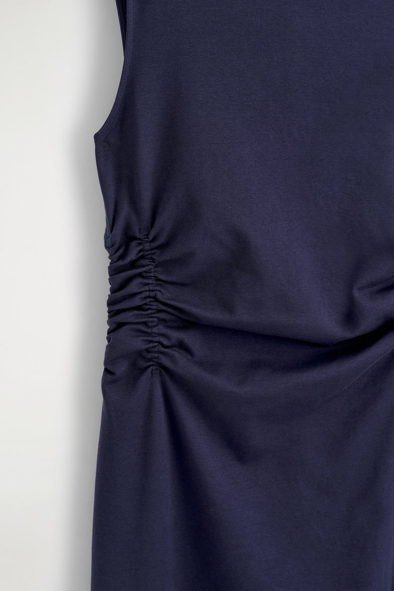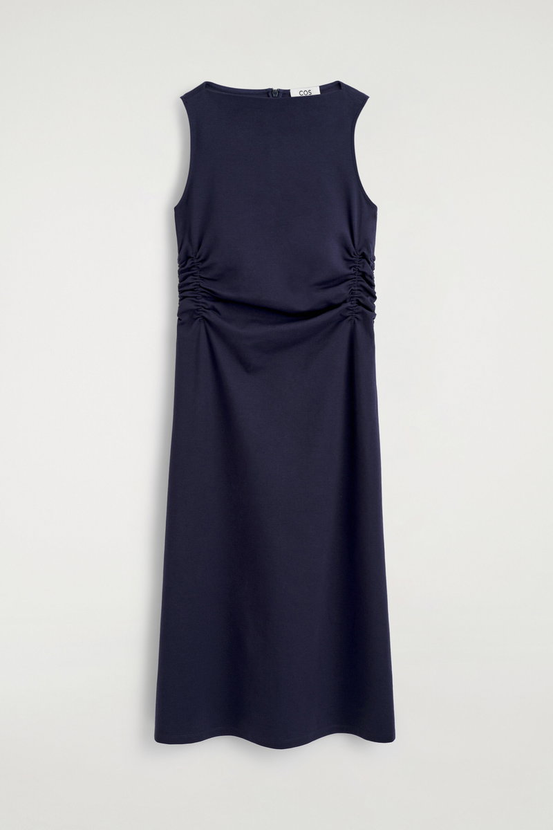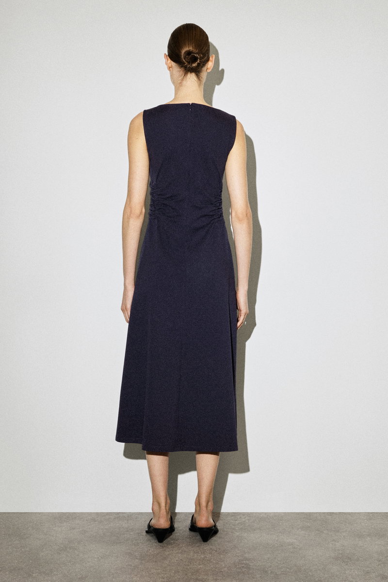Defined by ruched detailing at the waist, this sophisticated midi dress is crafted from soft cotton-blend jersey in an enduring navy tone. Style it with ballet flats and simple jewellery.