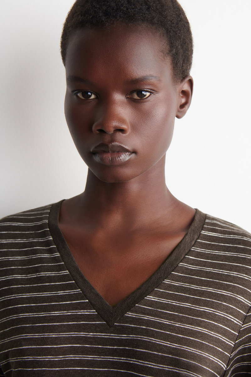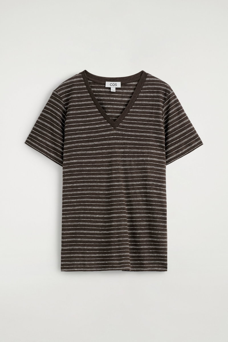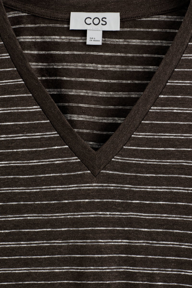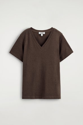 The COS womenswear team present an everyday icon, perfected. This refined T-shirt is crafted from 210gsm linen-jersey, chosen for its natural breathability and soft handle. It's cut in a classic V-neck shape and comes in an enduring ivory tone.