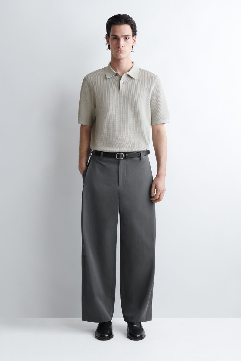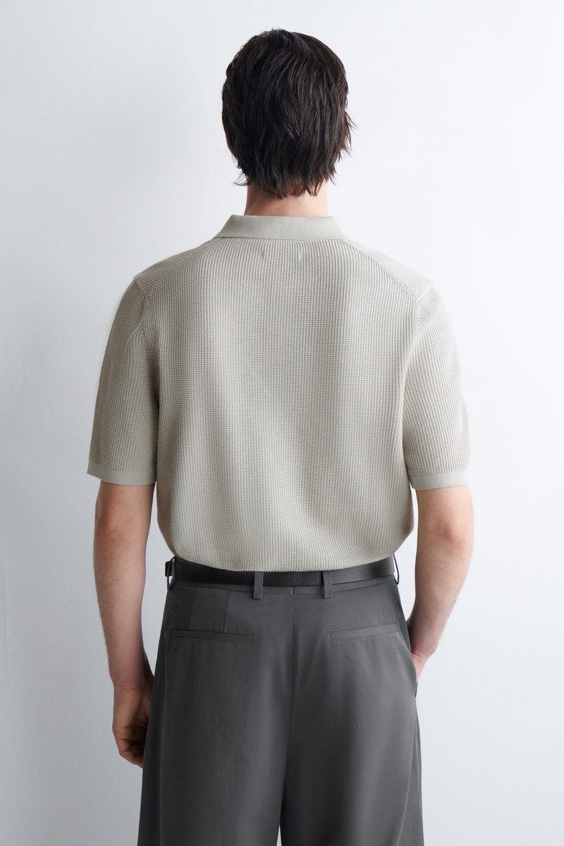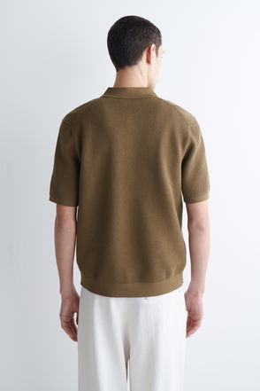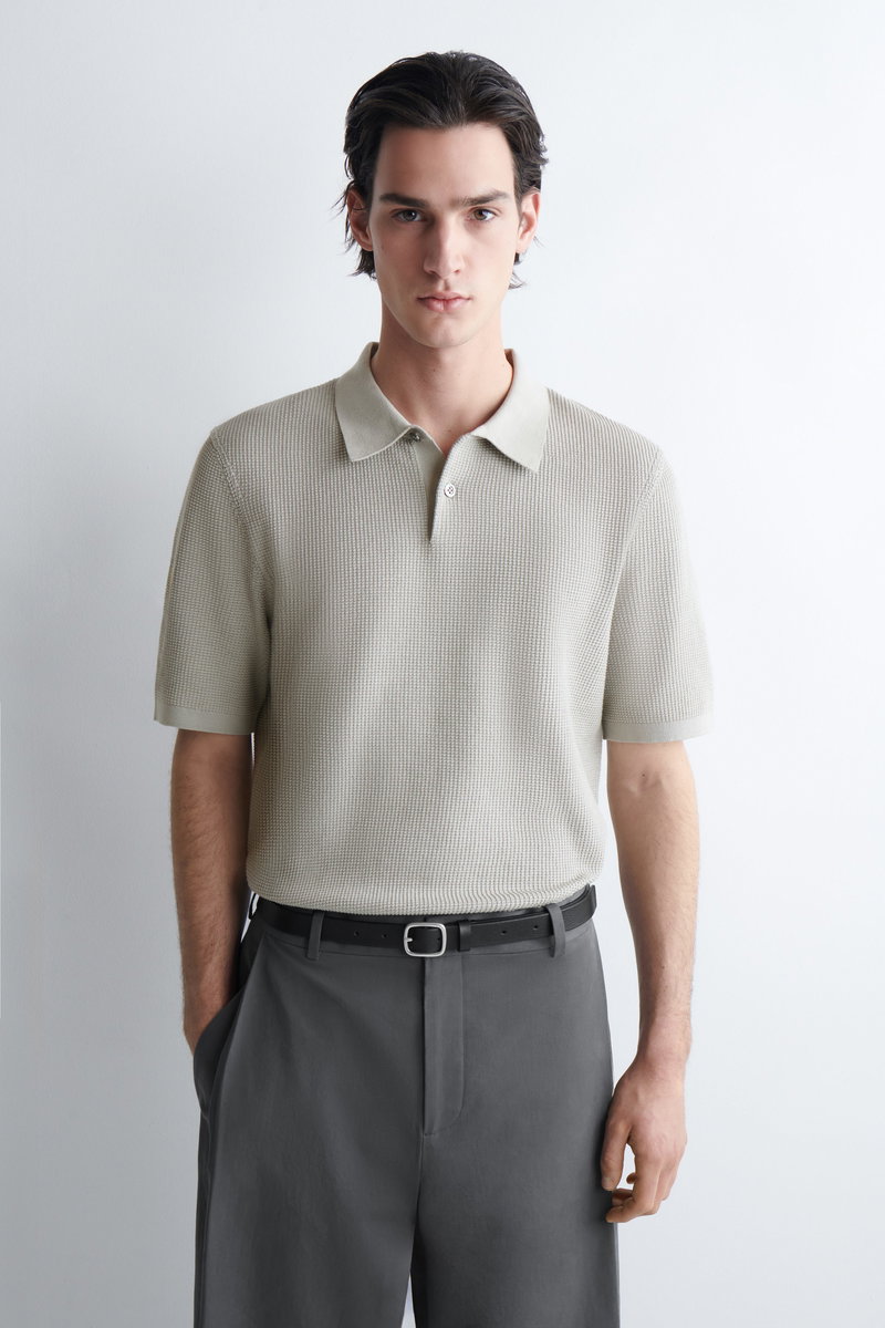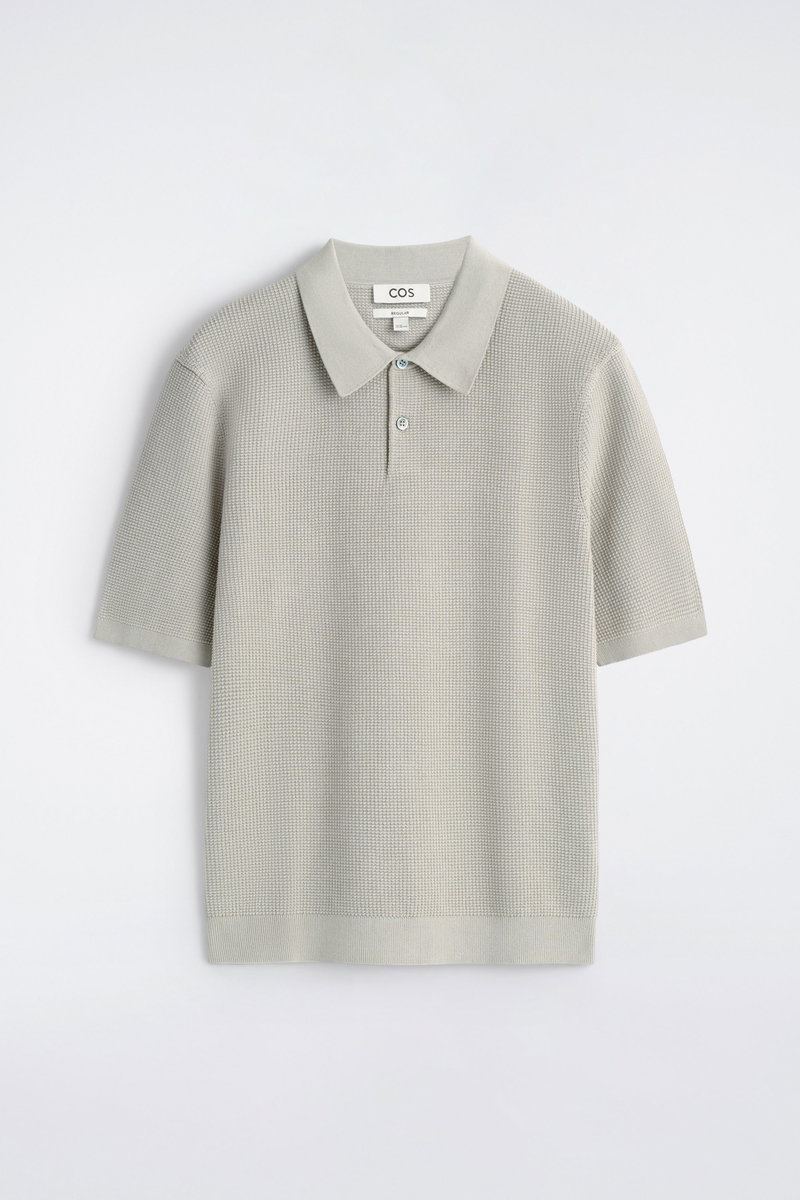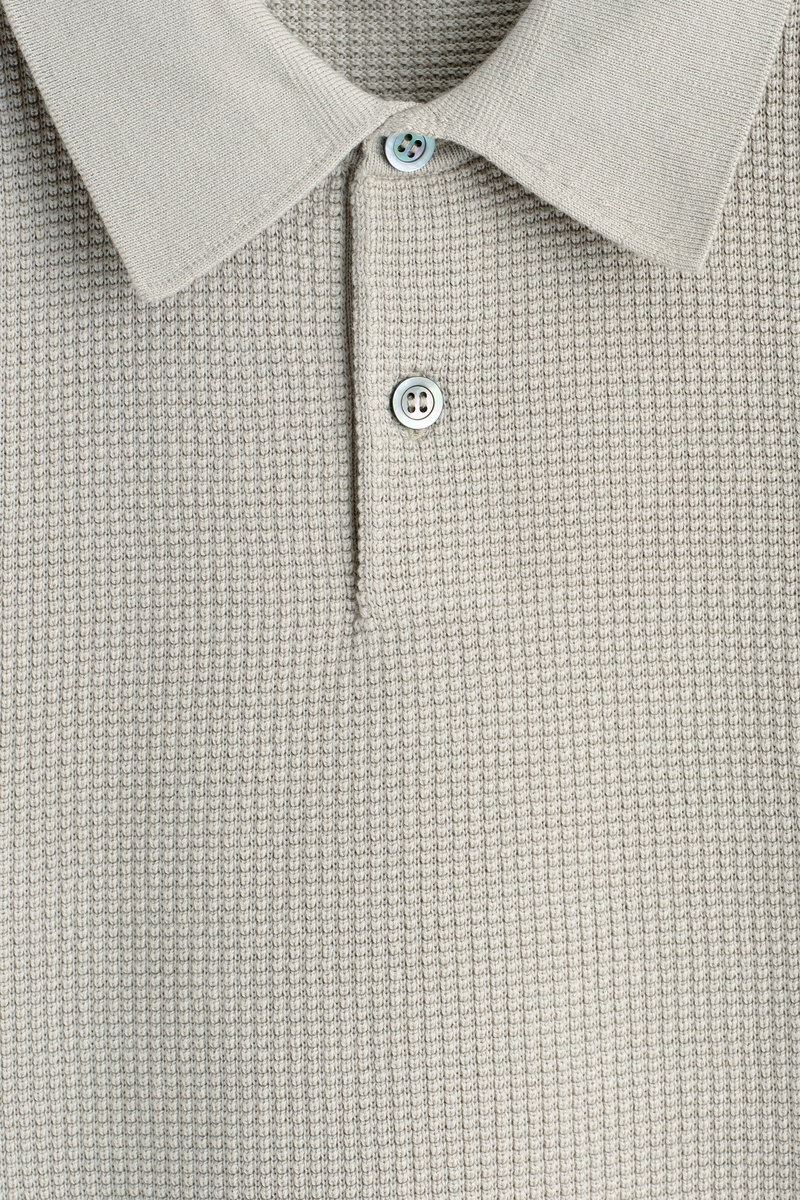 This modern polo shirt is made from soft cotton in a micro waffle knit that lends subtle texture. It comes in a rich beige hue that goes with most pieces in your wardrobe and features shell buttons and a ribbed collar, sleeves and hem.