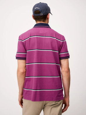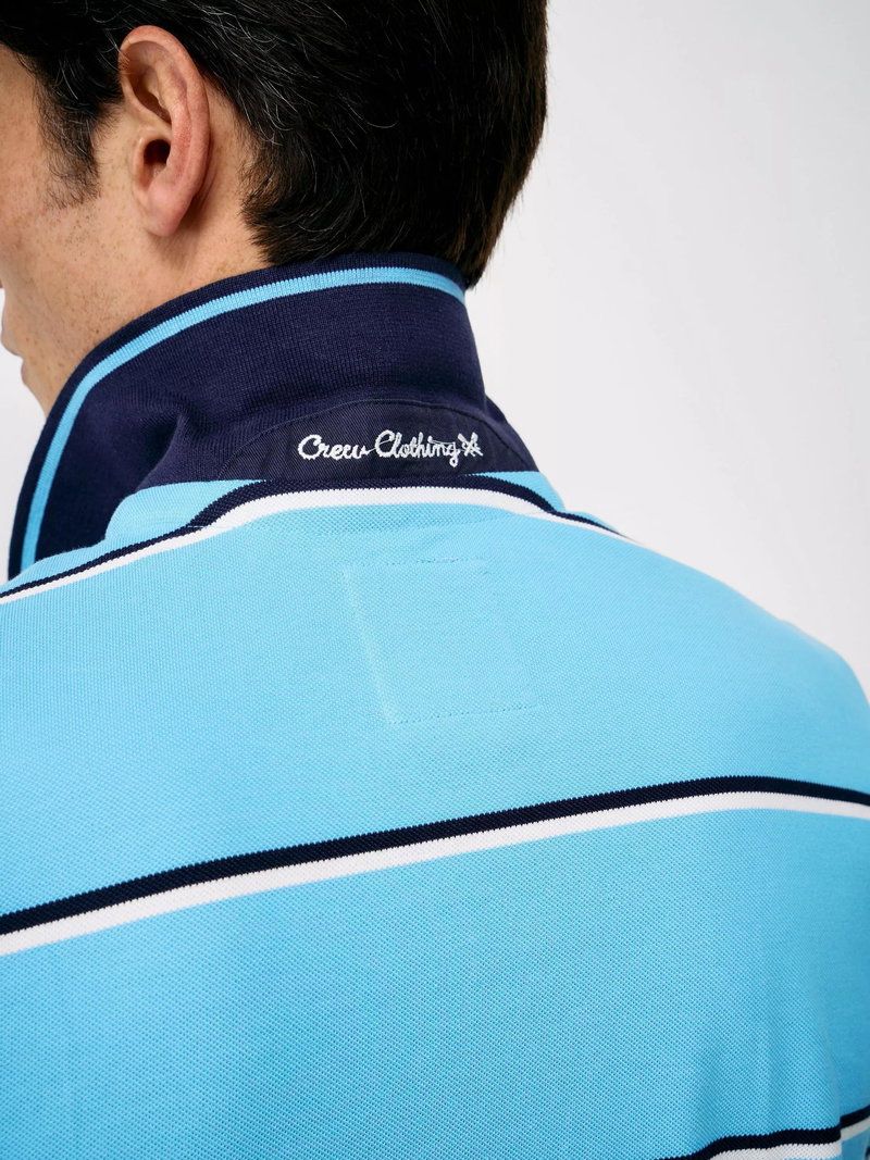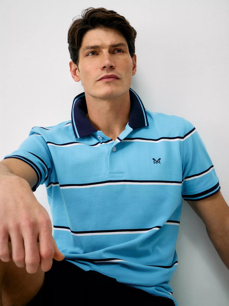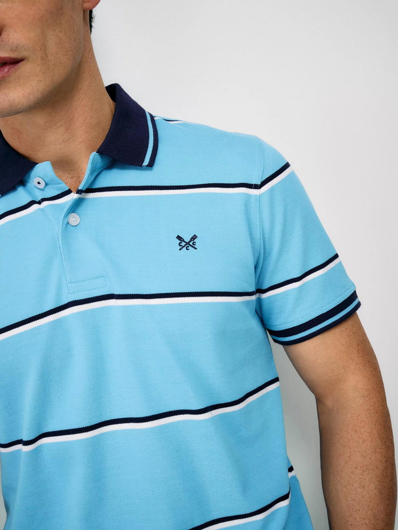 A men's fine Oxford stripe polo shirt in blue with navy and white stripes, refreshed with a slimmer stripe for a cleaner, more modern look. Cut from 100% cotton, this polo features the same pique texture that gives it a relaxed, lived-in feel. Finished with ribbed trims, signature embroidery under the collar and crossed oars embroidered on the chest, it's an easy, sporty staple. Pair with jeans or chinos for everyday wear.