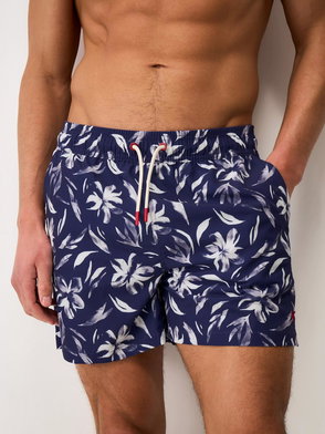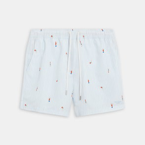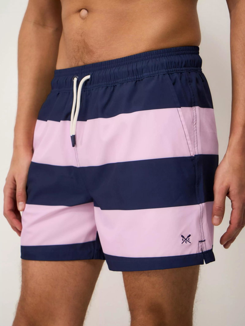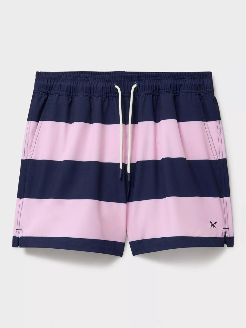 Featuring a classic heritage stripe, these swim shorts are made from a quick-dry polyester blend with a breathable mesh lining. The rubber-tipped drawstring waist ensures a comfortable fit, while the back pocket with riptape fastening keeps essentials secure. Finished with the Crew Clothing signature crossed oars embroidered on the hem.