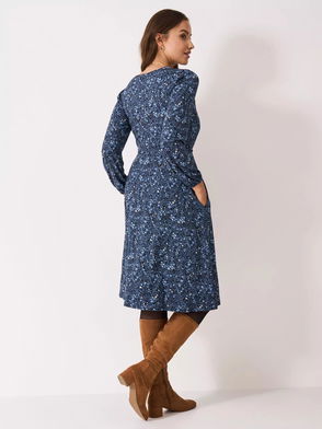The Leah dress from Crew Clothing is made from floaty viscose, with an all-over geometric pattern. In a shift silhouette, it has a box pleat beneath the button placket for movement, elbow-length sleeves and a classic collar.