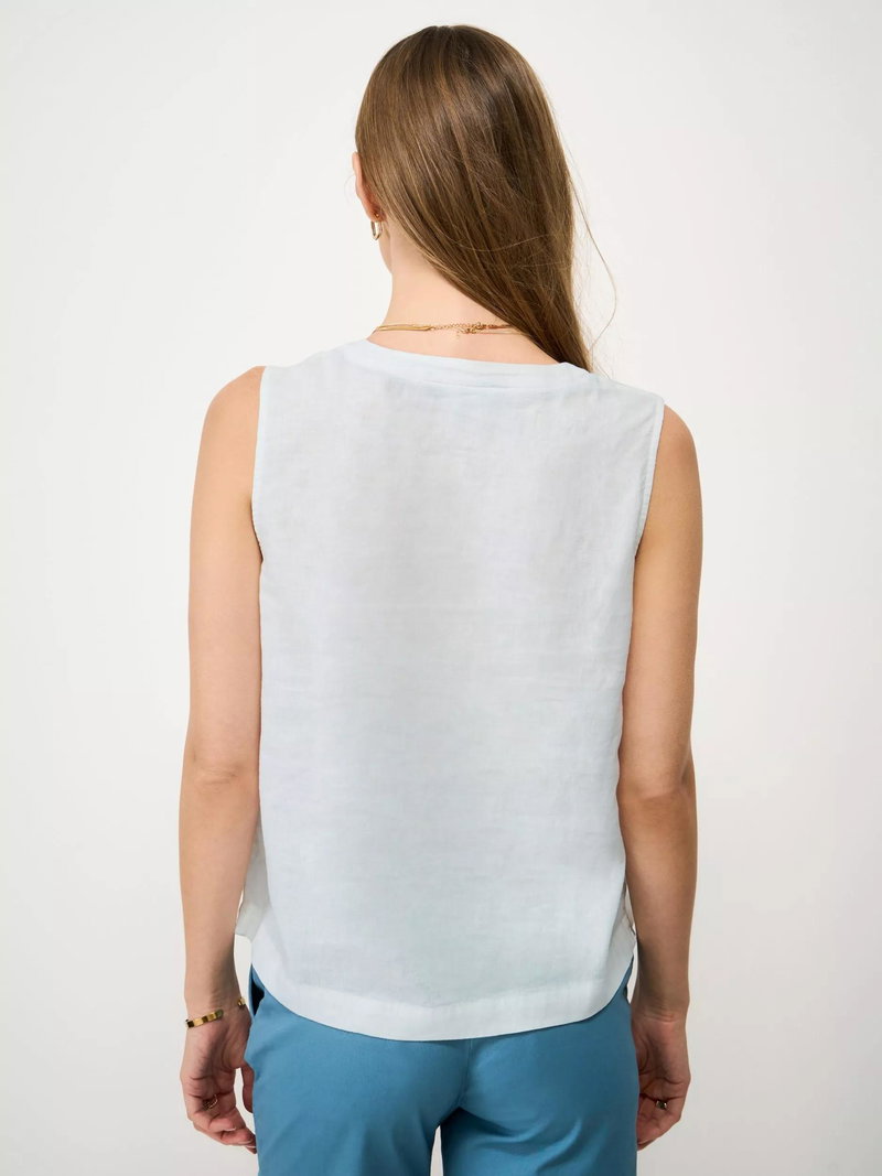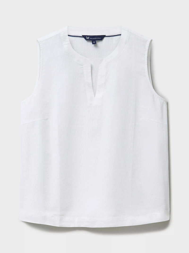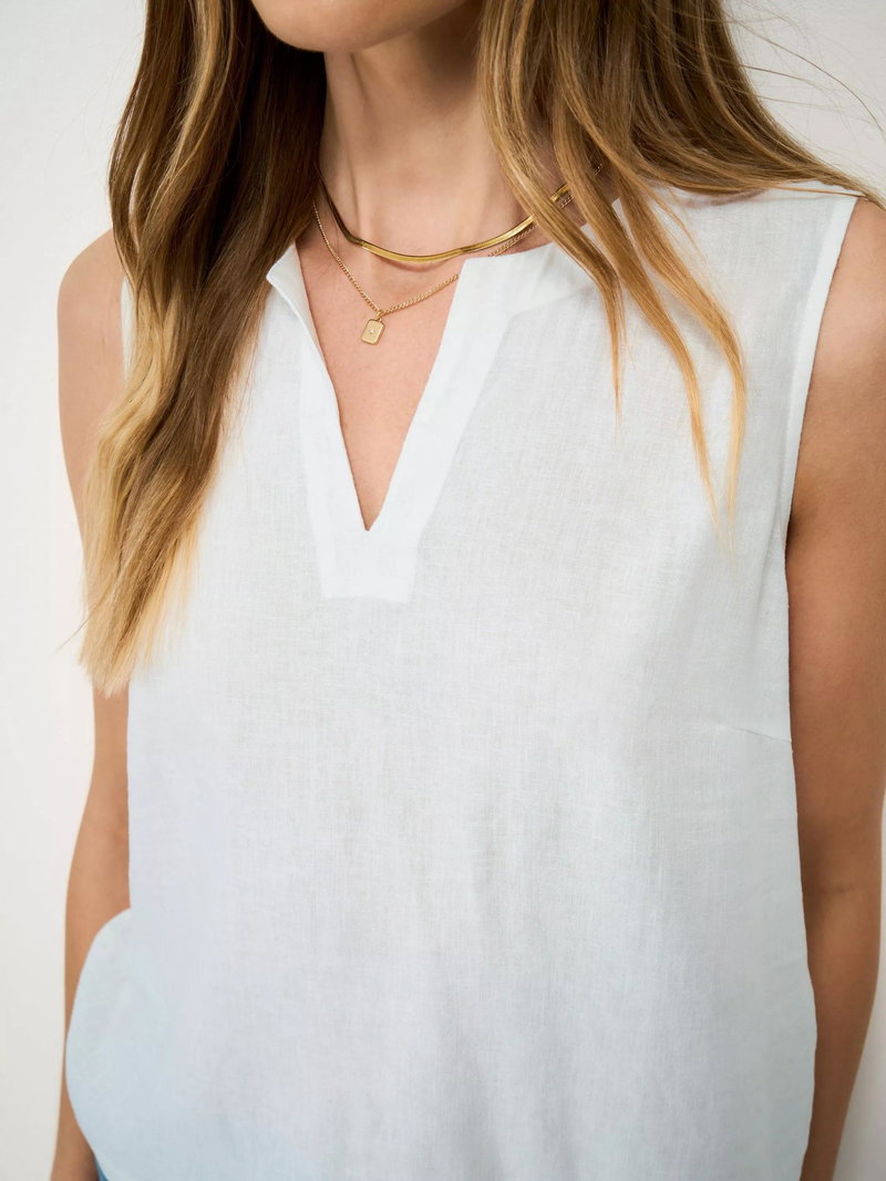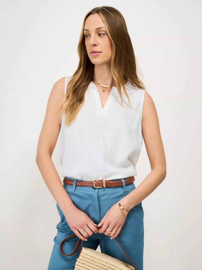 The Shelley woven top, made in a soft blend of linen and viscose. This elevated essential is styled in a relaxed fit through the body for a flattering look. The notched neckline detail completes this sleeveless style. Your new summer go-to.