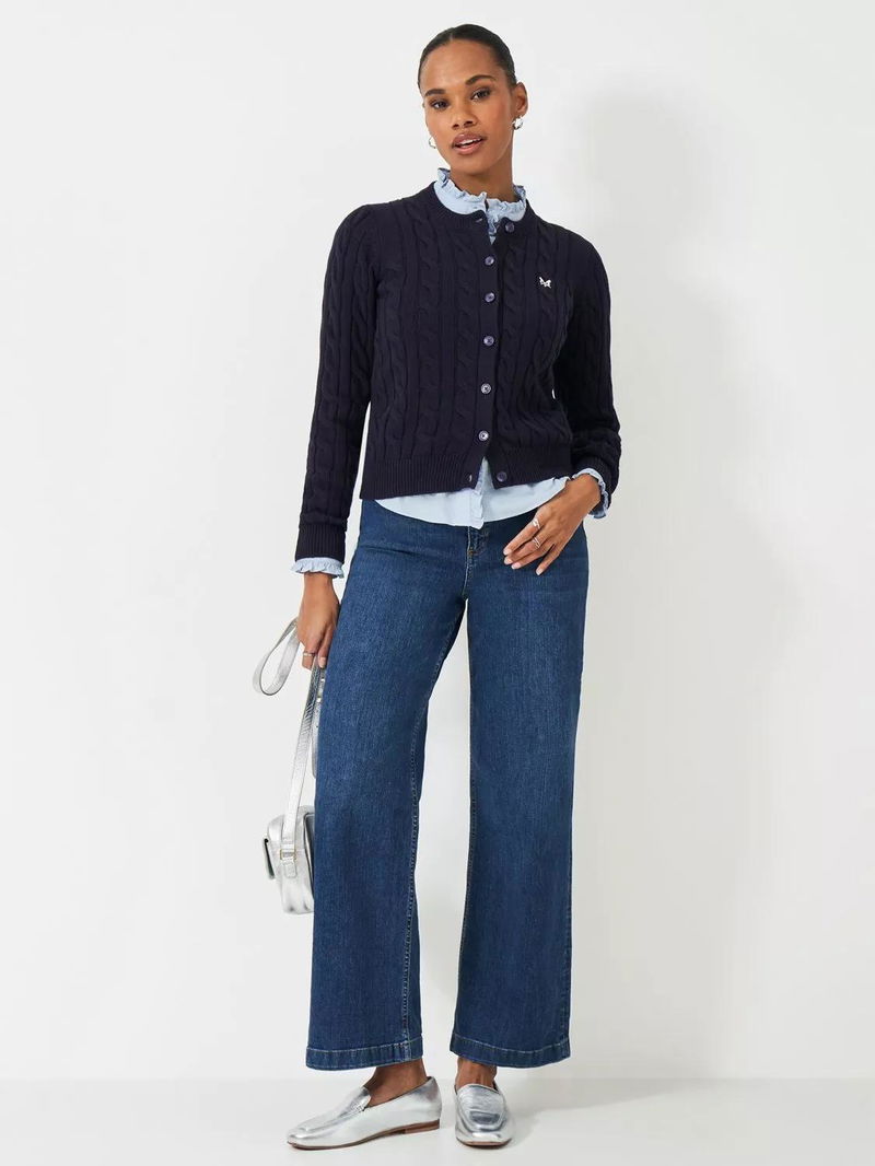 A cable knit cardigan. Perfect for the warmer months, this classic cardigan is knit from 100% cotton for a lightweight feel, and we've added branded buttons for the perfect finishing touch. Wear alone, buttoned up as a jumper, or layer over your favourite Breton. A heritage favourite.