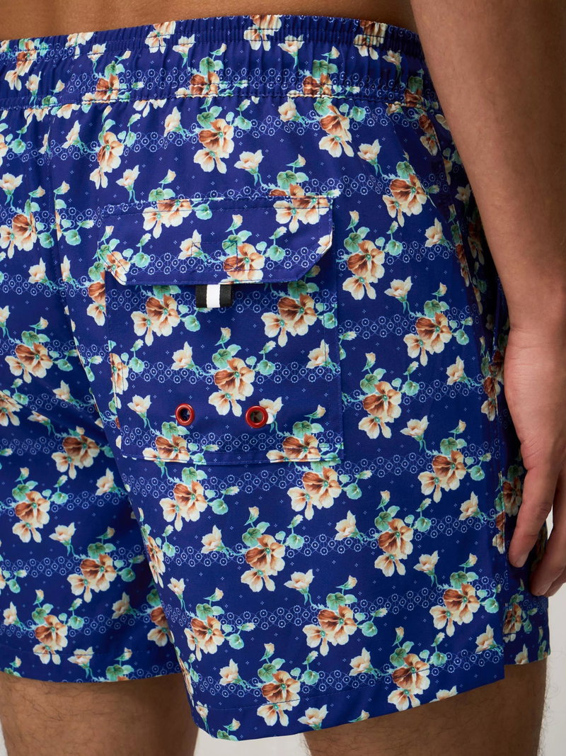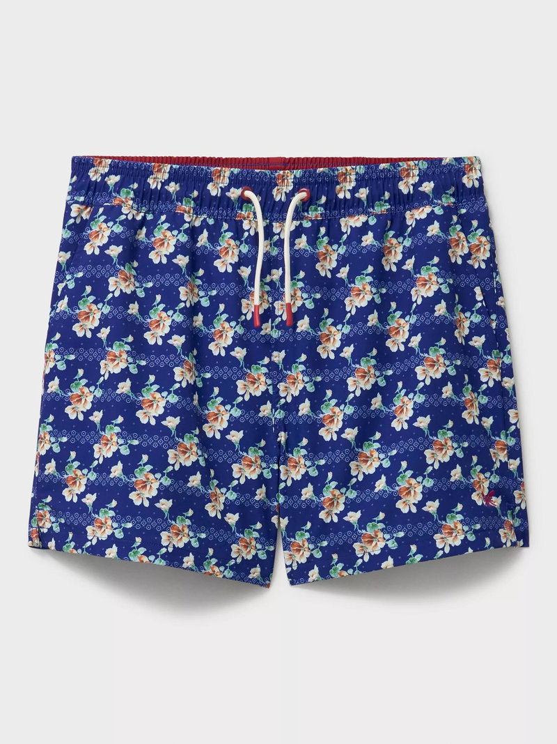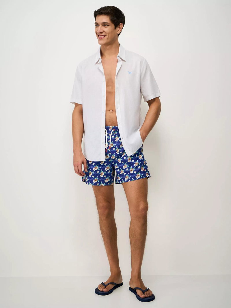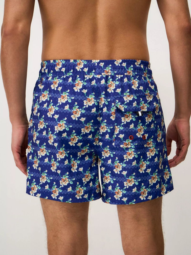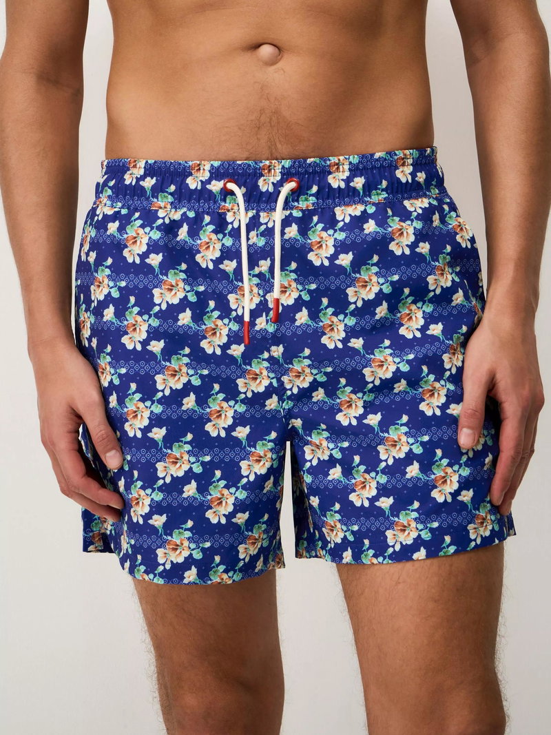 Swim shorts with a tropical floral print and crossed oars embroidery. Lined with mesh and fitted with drawstrings, these slightly stretchy swimming shorts are designed to fit comfortably.