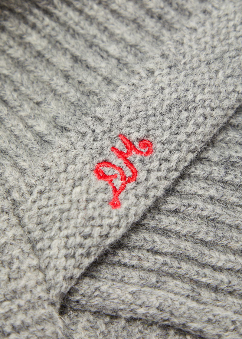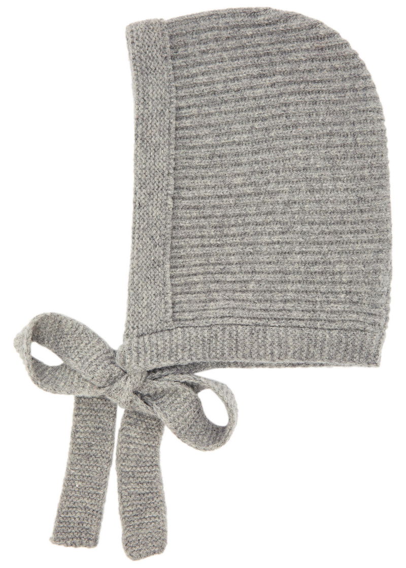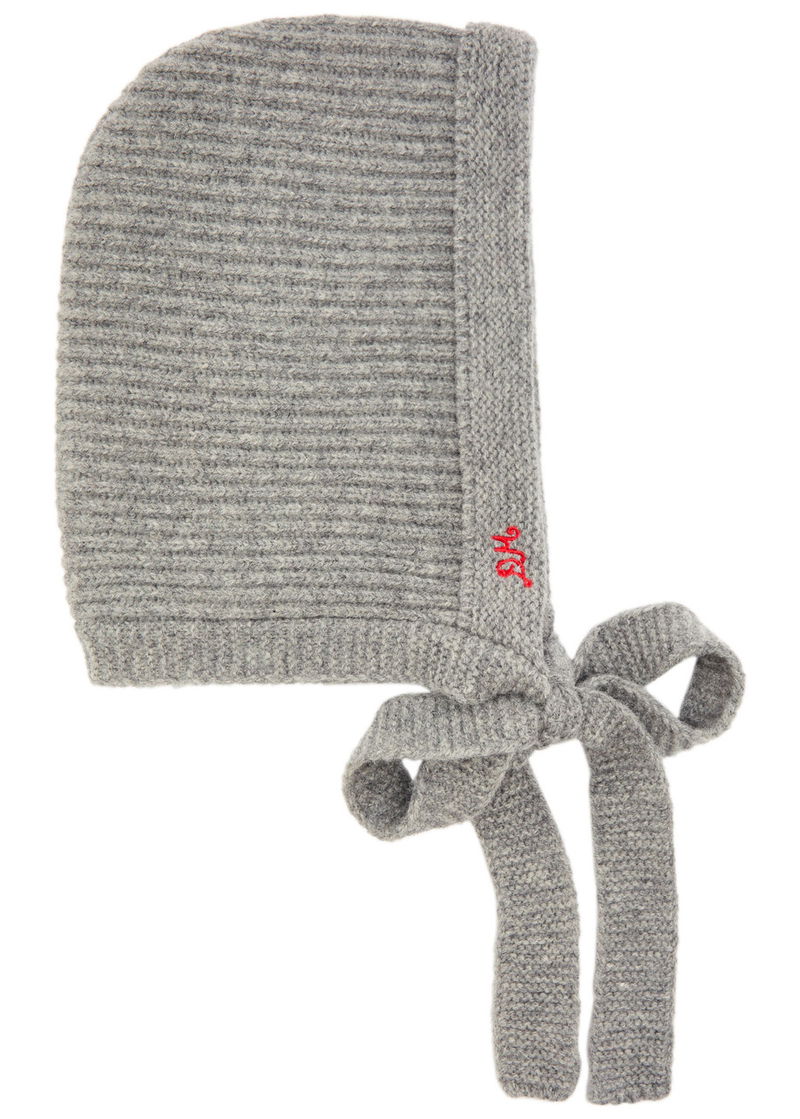 Damson Madder wool bonnet. Logo embroidery at turn-up hem, neck ties.