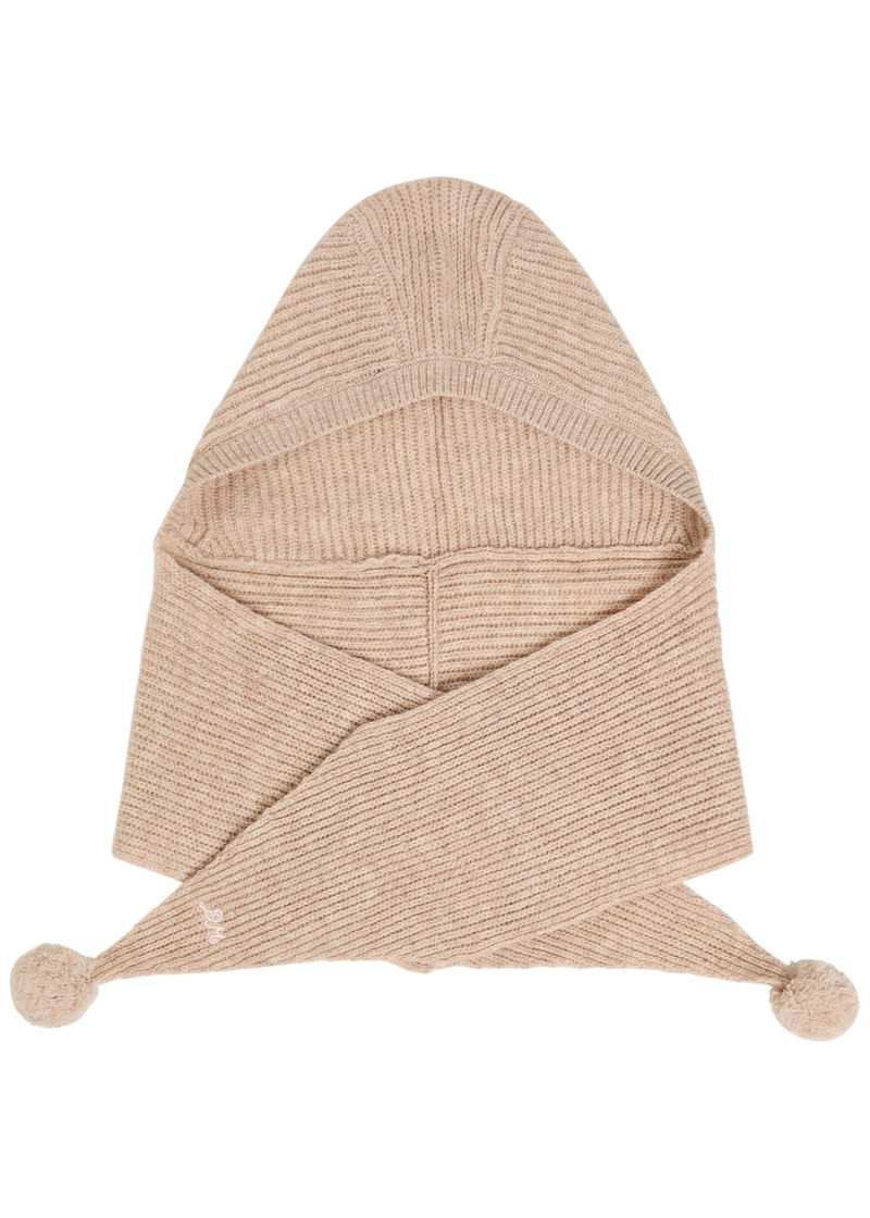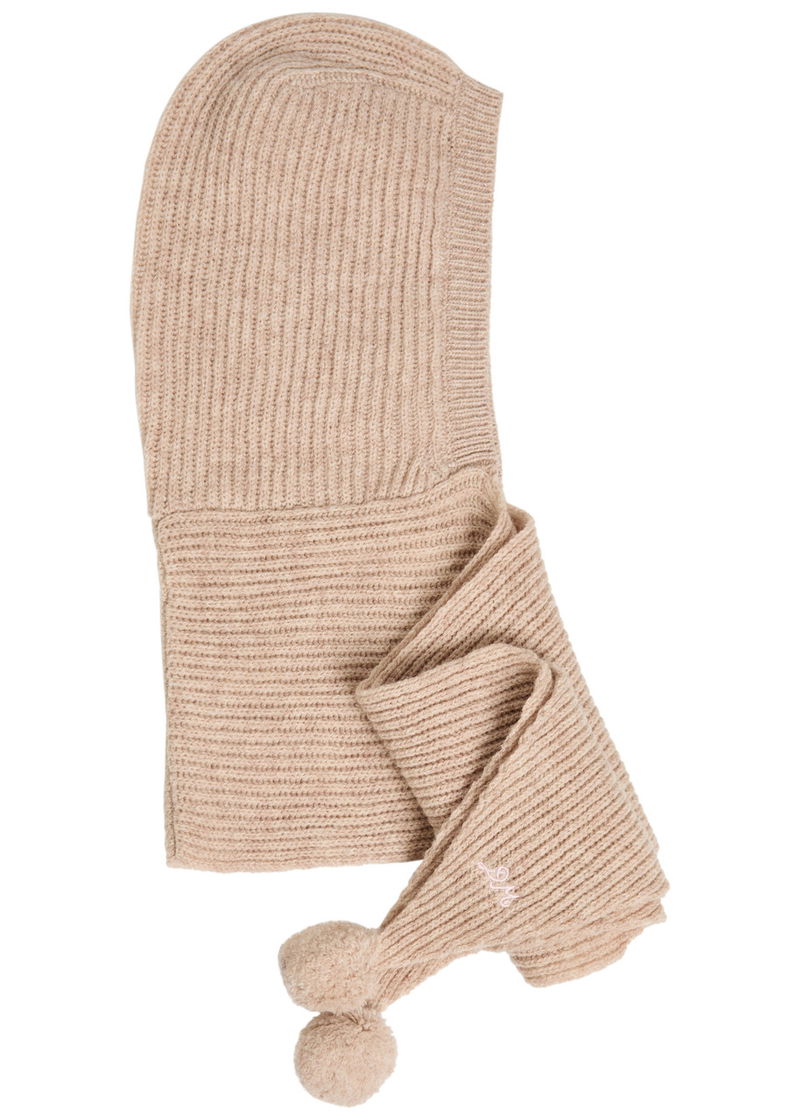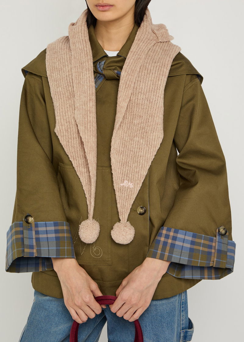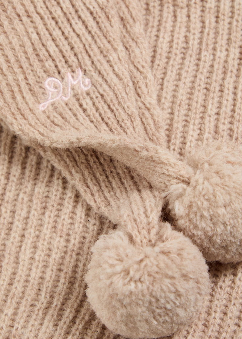 • Pom poms at neck ties, logo embroidery, ribbed trims