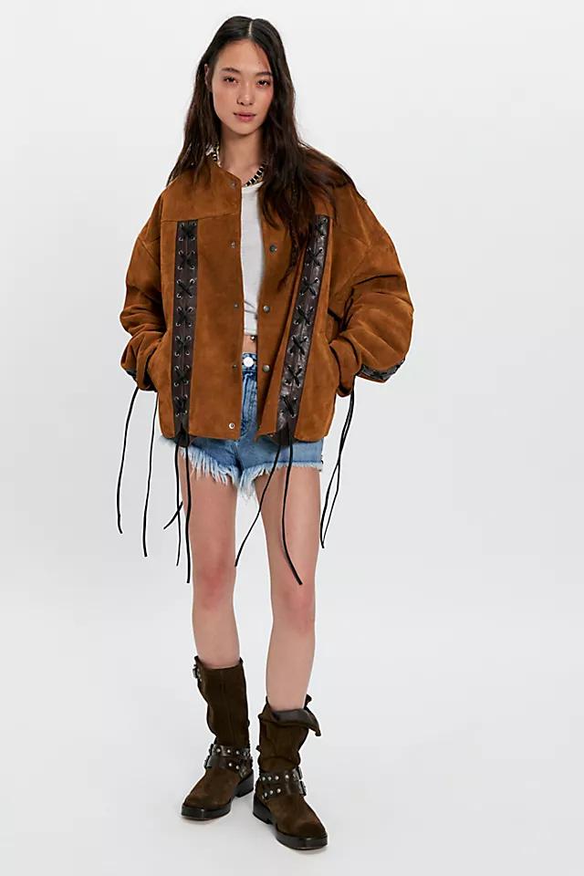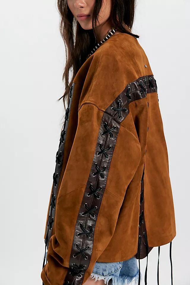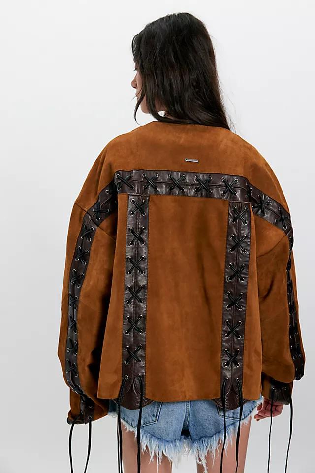 Your new forever layer, this edgy jacket from Deadwood features an oversized, boxy silhouette, leather rope lacing, and suede fabrication made from upcycled deadstock fabrics.