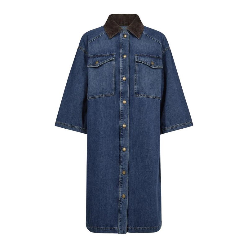 Stay stylish and comfortable in this cool denim dress from Mos Mosh. Featuring long sleeves, velvet collar, oversized chest pockets, relaxed silhouette, and front button closure.
