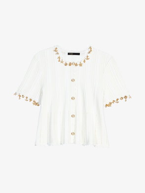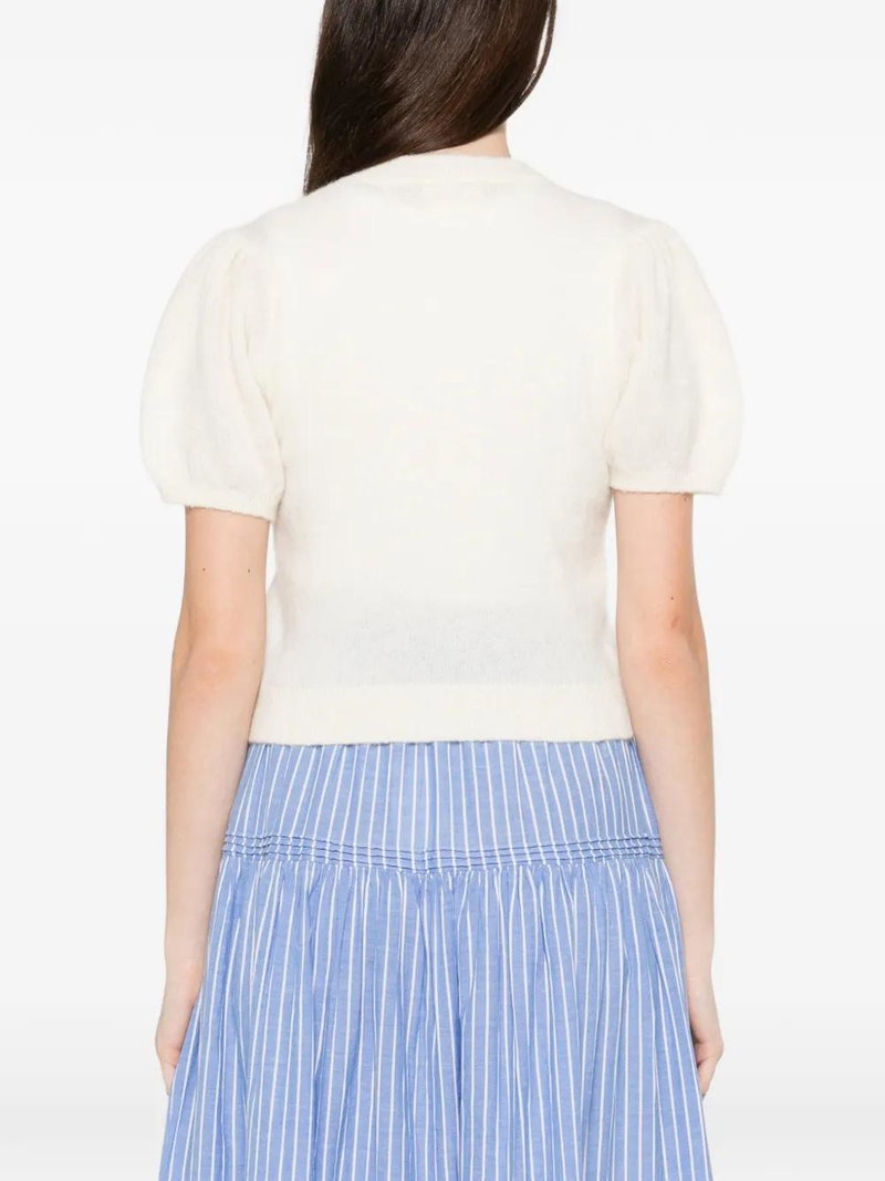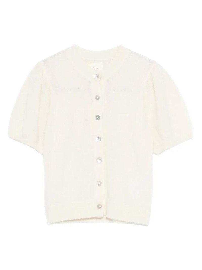 Off-white front button fastening short sleeves puff sleeves ribbed hem ribbed cuffs.