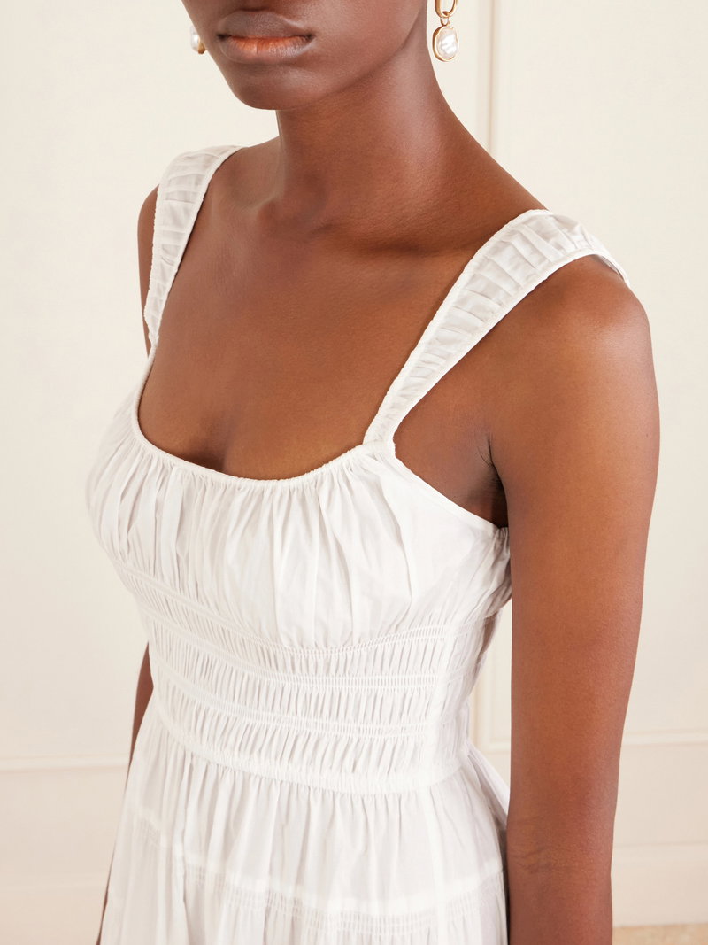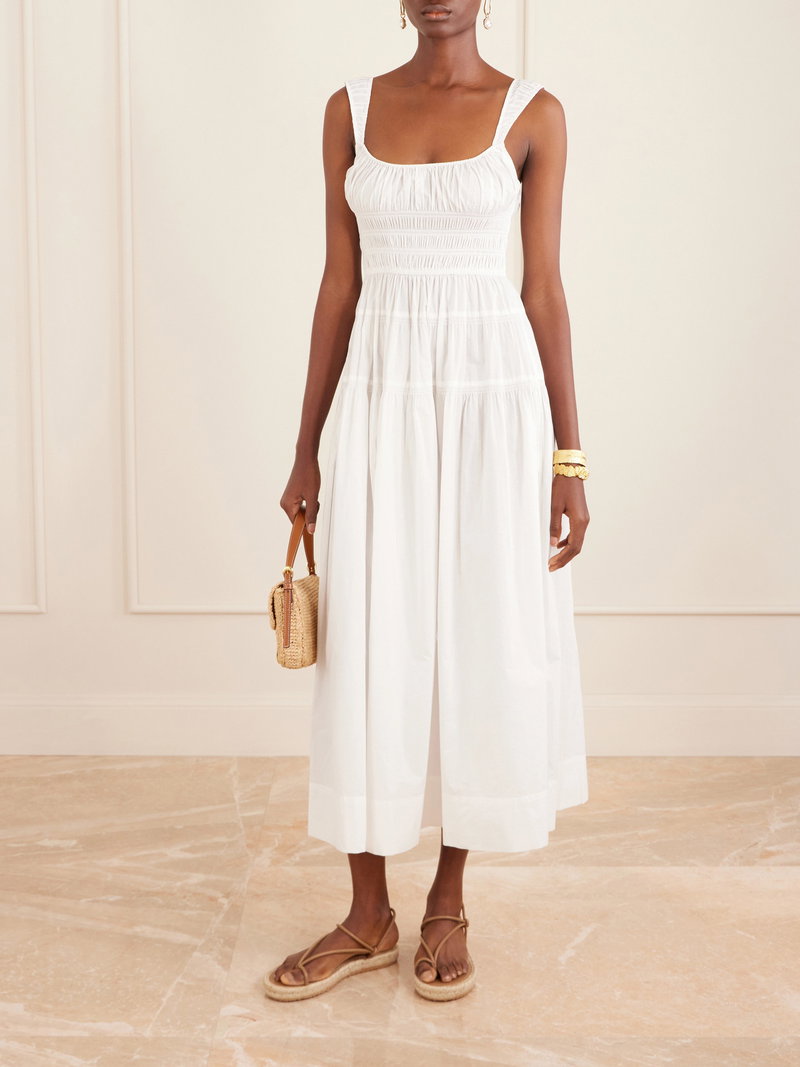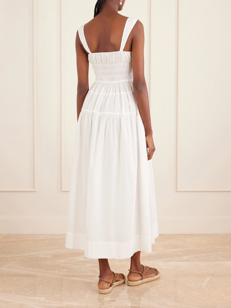 DÔEN’s ‘Clover’ dress evokes a sunlit, romantic mood. Cut from crisp organic cotton-poplin, it’s shaped with a gently scooped neckline and a shirred bodice that releases into a tiered, flowing midi skirt.