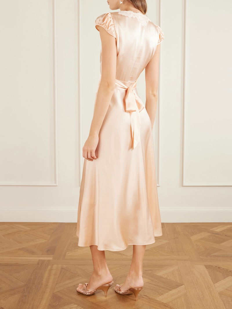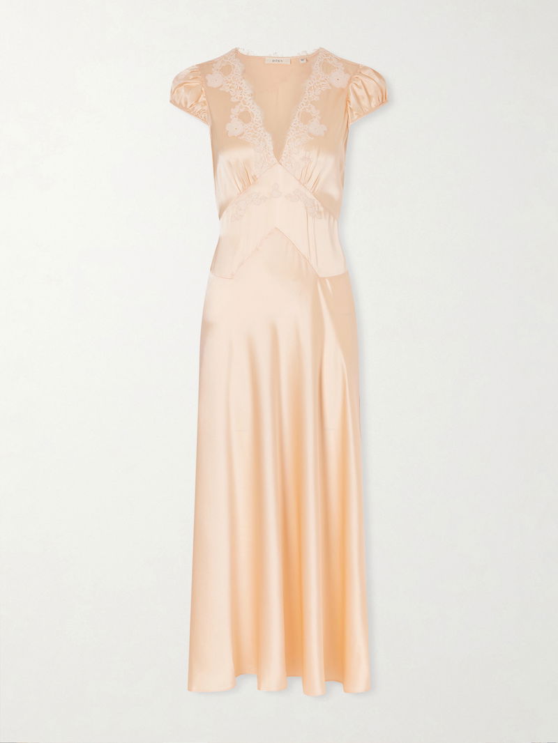 DÔEN's 'Coraline' maxi dress takes cues from romantic lingerie. Designed with lace trims along the V-neckline, it's made from panels of lustrous silk-satin that are strategically cut and placed to draw the eye inward and has gently puffed sleeves. Adjust the slim ties to accentuate the waist.
