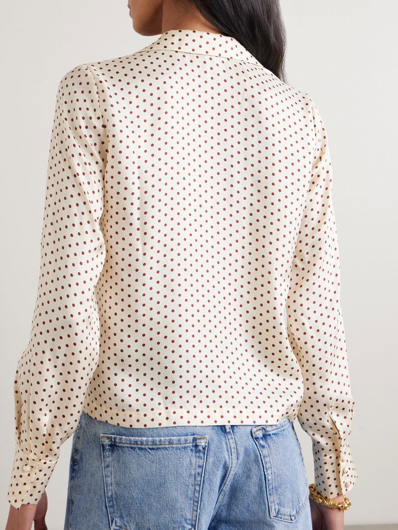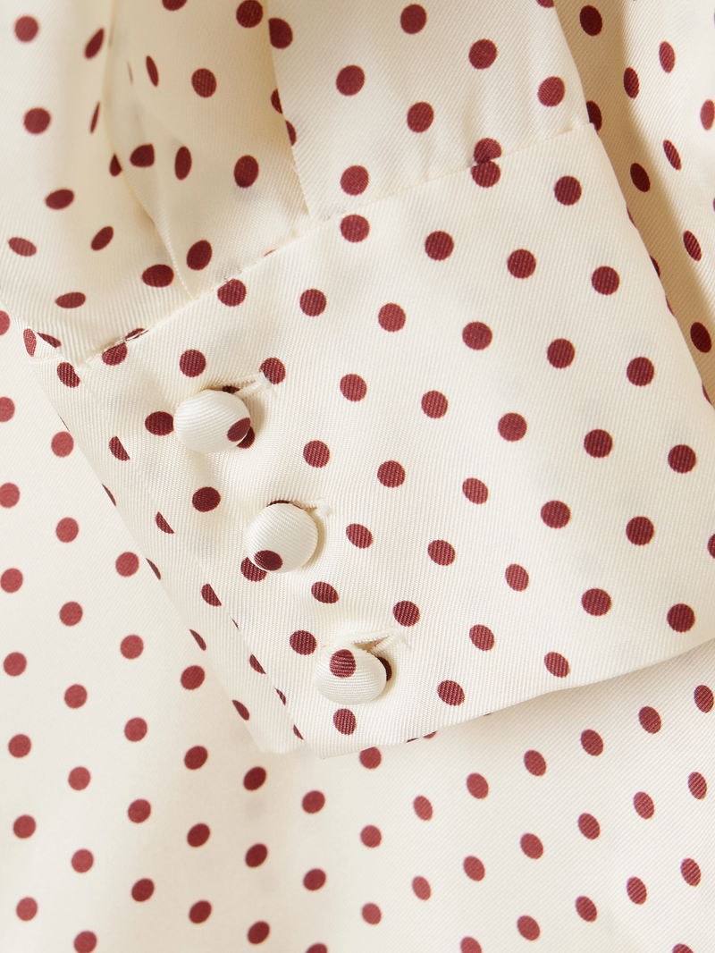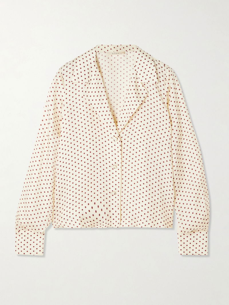 DÔEN's 'Elene' blouse is modelled on styles from the '40s. It's made from lustrous silk-blend twill patterned with polka-dots and has elegant notch lapels and covered buttons. Wear yours with jeans or floaty shorts.