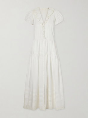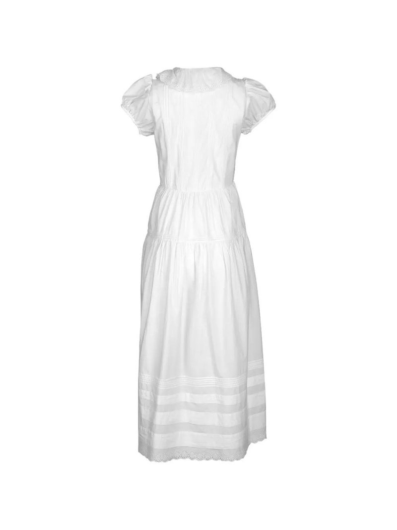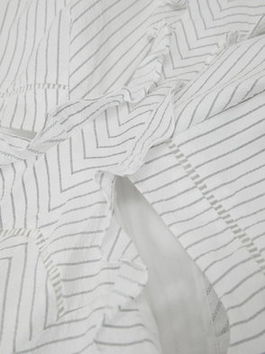 White V-neck short sleeves lace trim front button fastening ruffled trim.