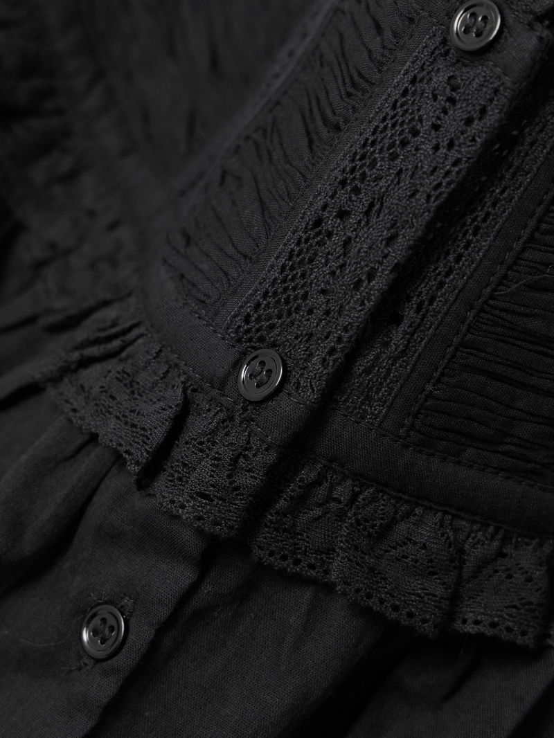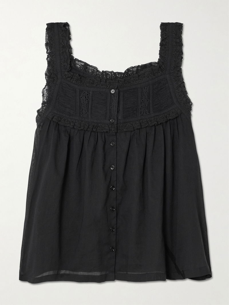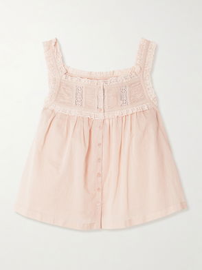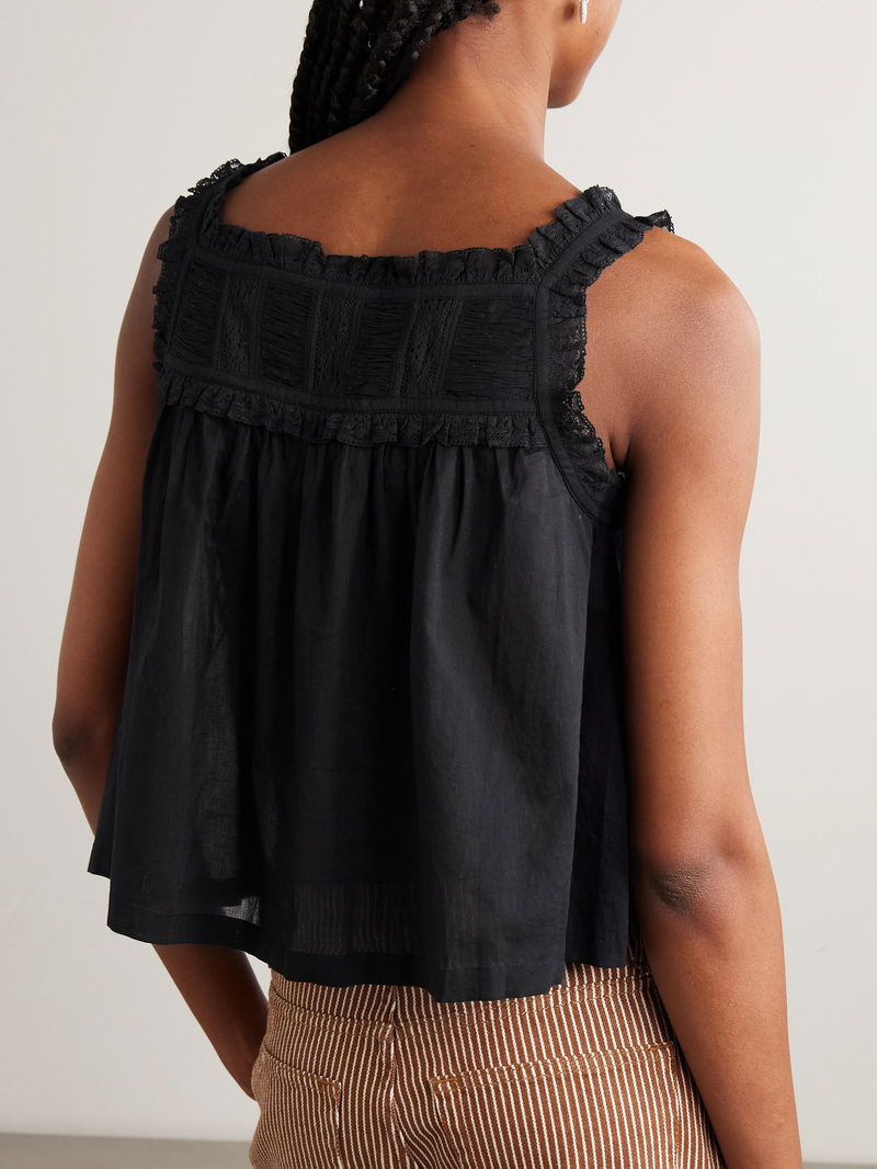 DÔEN's bohemian collections channel the charm of vintage styles and the spirit of coastal California from decades past. This 'Fidella' top is made from airy organic cotton-voile that's loosely gathered and is trimmed with delicate lace and ruffles at the bust and straps. It's cut for a cropped fit, so it'll look great styled with jeans and midi skirts.
