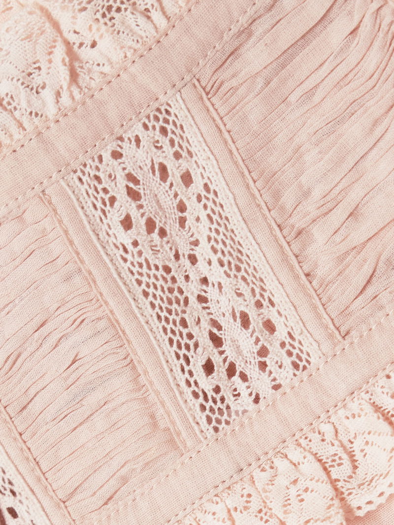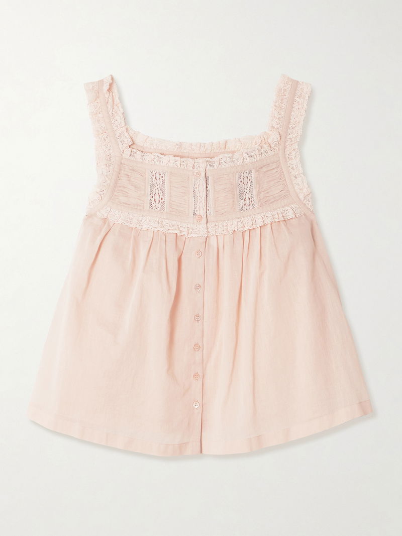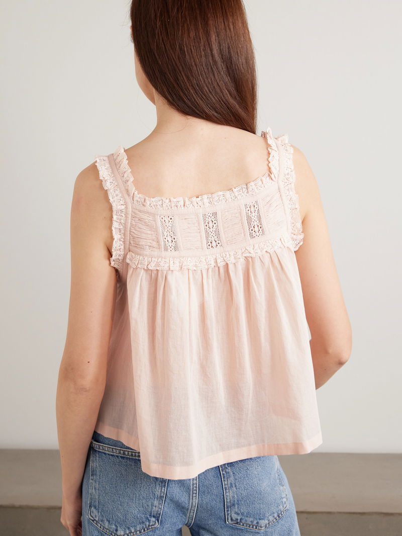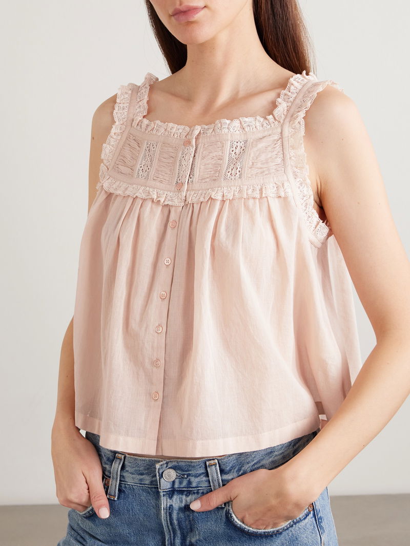 DÔEN's bohemian collections channel the charm of vintage styles and the spirit of coastal California from decades past. This 'Fidella' top is made from airy organic cotton-voile that's loosely gathered and is trimmed with delicate lace and ruffles at the bust and straps. It's cut for a cropped fit, so it'll look great styled with jeans and midi skirts.