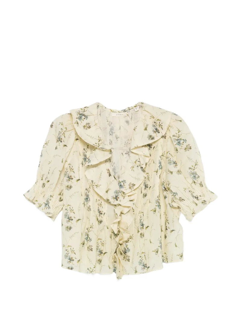 Yellow floral print ruffled detailing half-length sleeves V-neck.