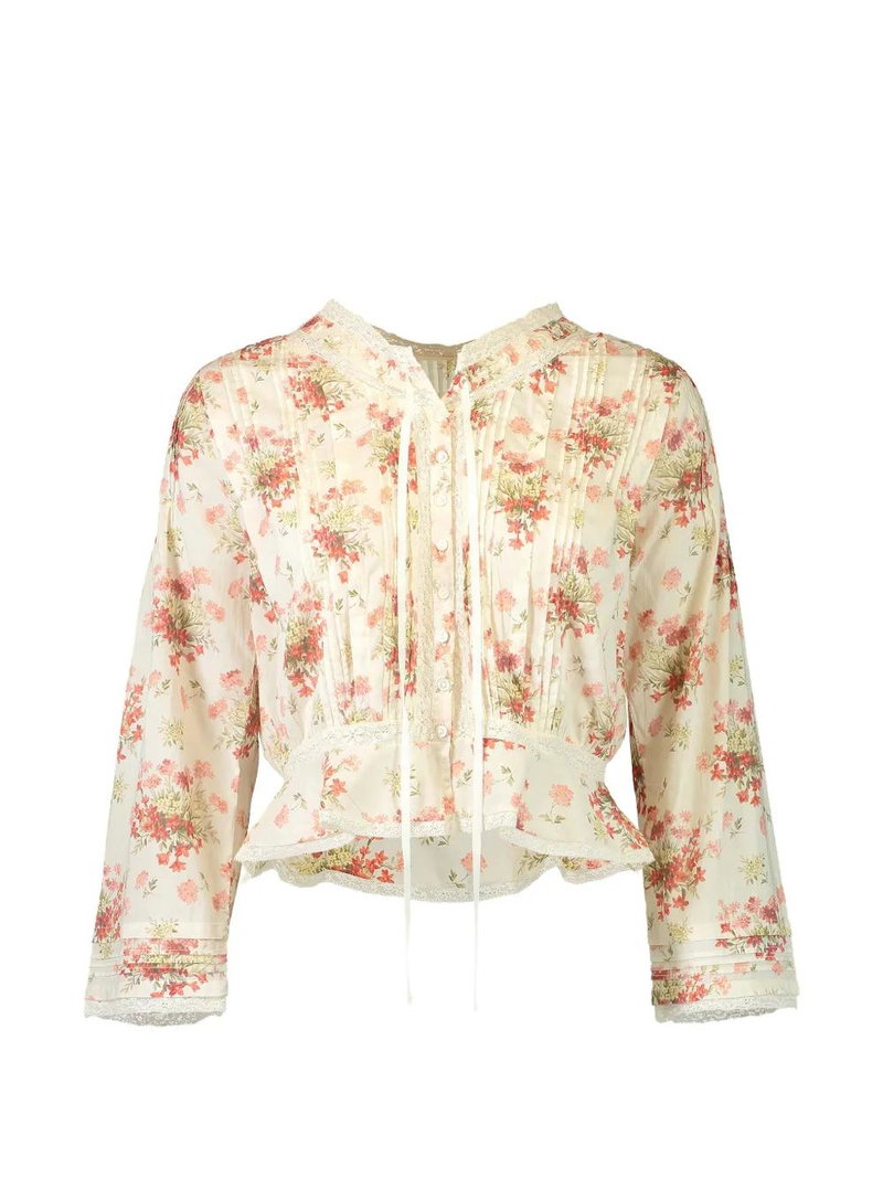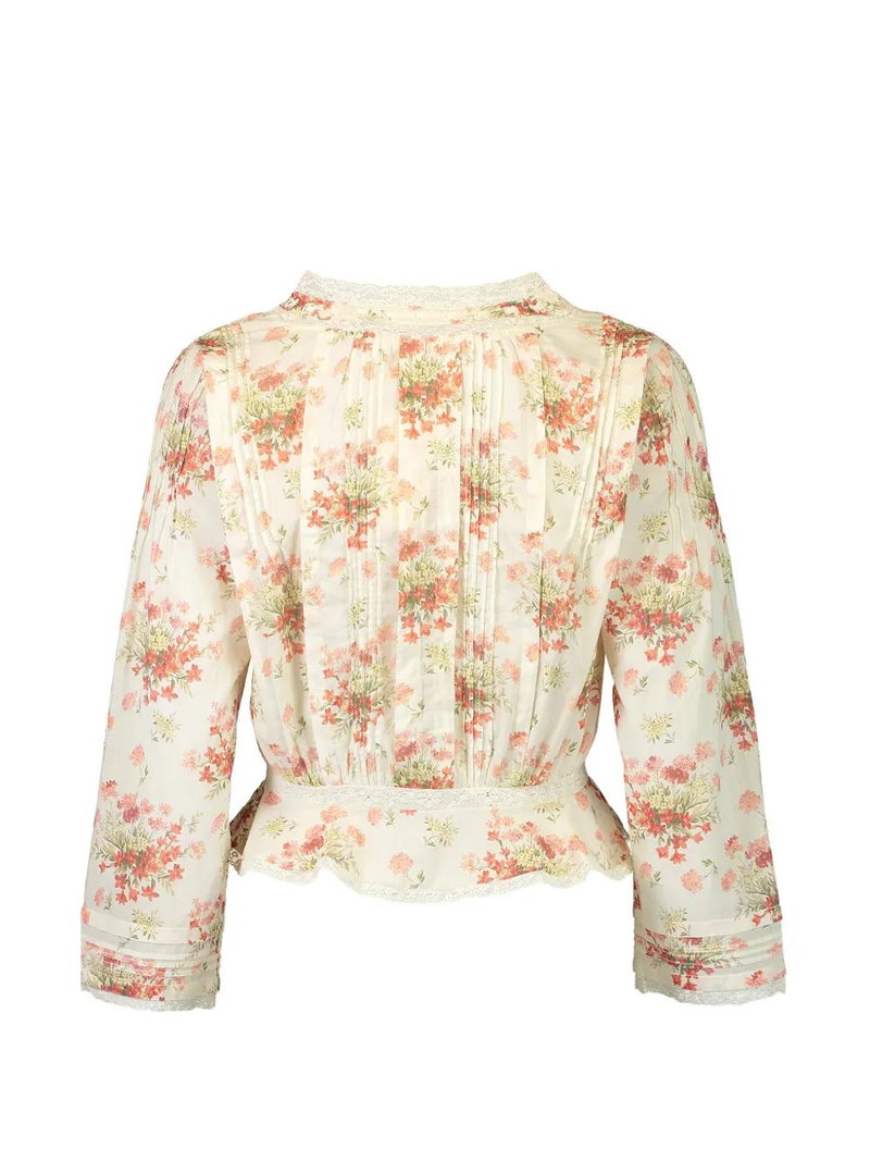 Cream white floral lace trim button fastening gathered details long sleeves pleated details.