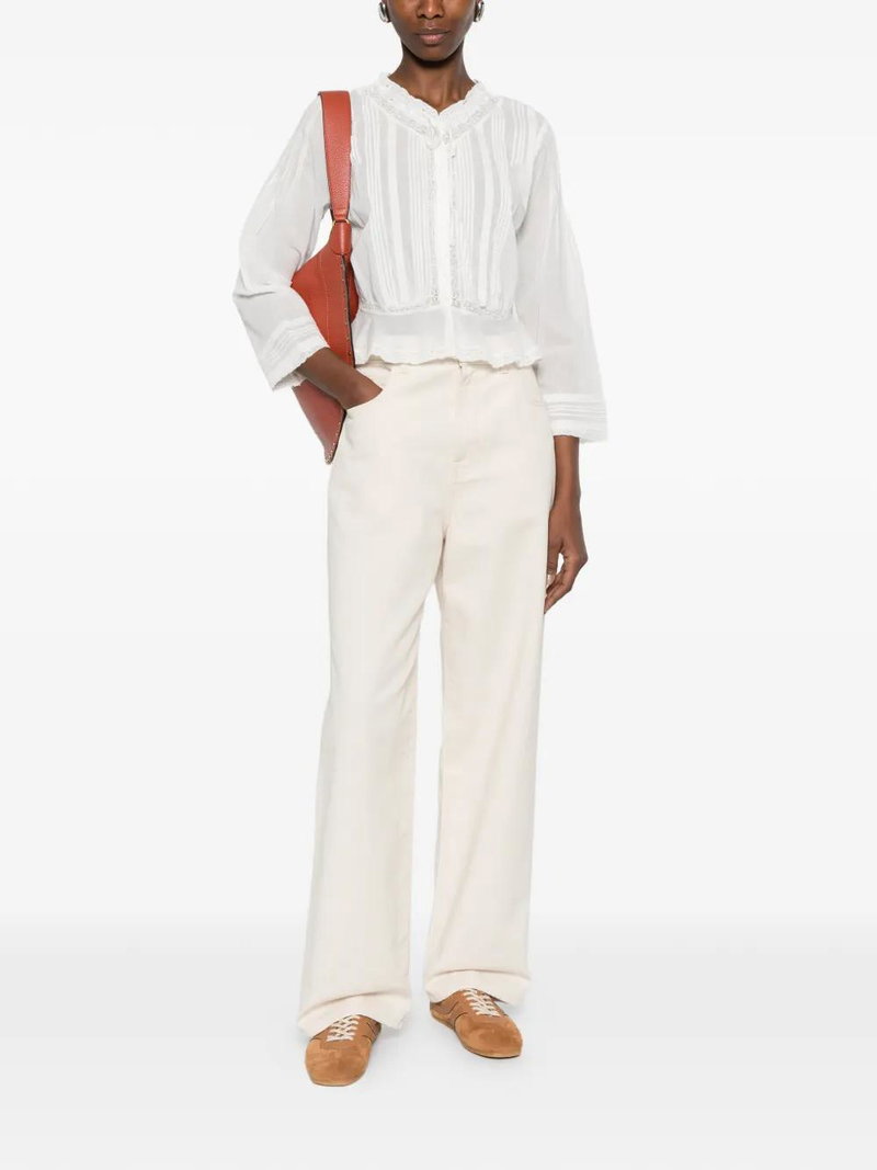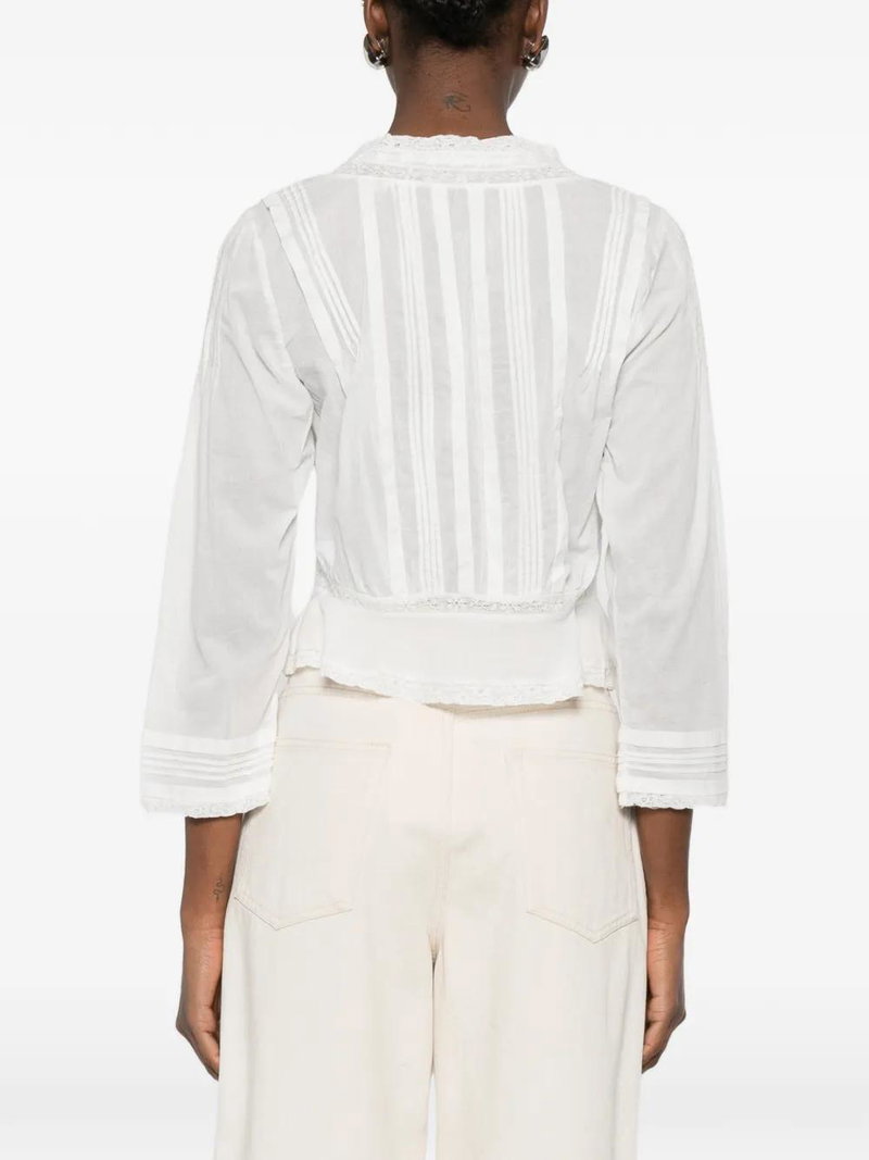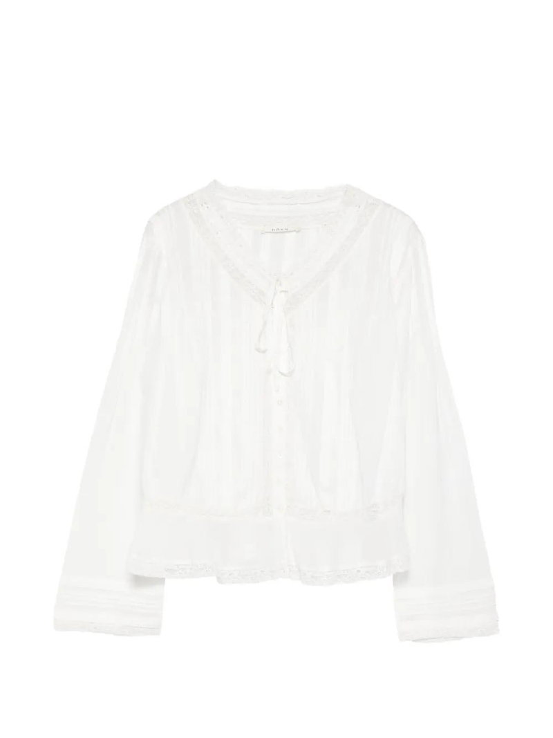 White lace detail front tie fastening button front fastening long sleeves ribbed cuffs.