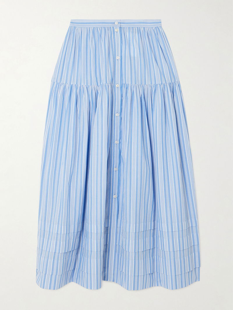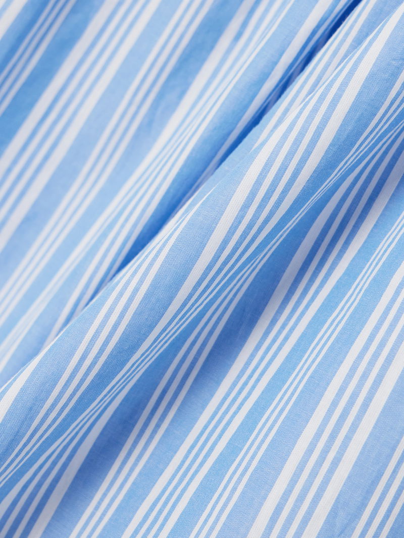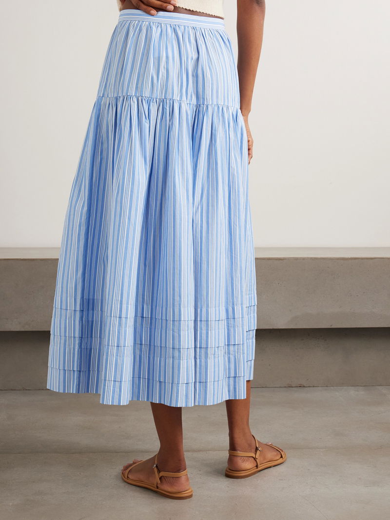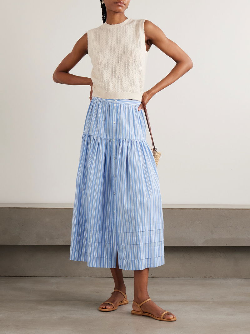 It's made from lightweight organic cotton patterned with stripes and has a floaty, tiered design.