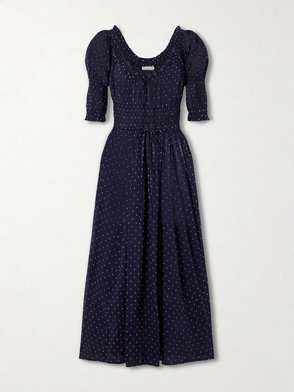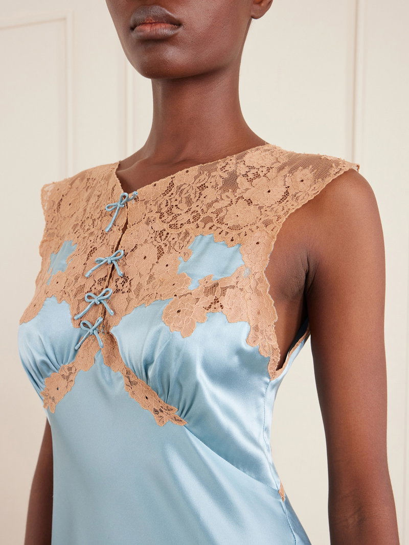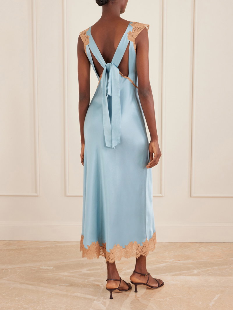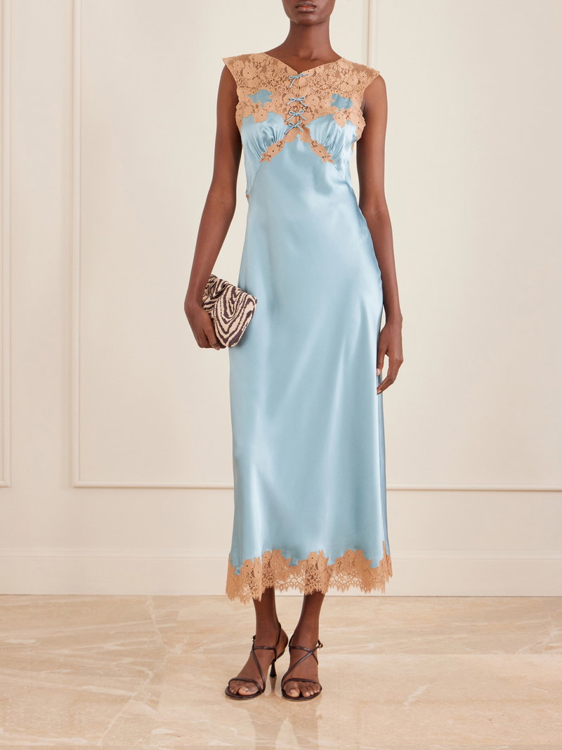 DÔEN’s 'Marcelle' silk-satin dress is shaped with a structured bodice detailed with lace panels and a row of buttons through the front. The fitted waist falls to a long, fluid skirt finished with an intricate hem. Style it with simple sandals for warm evenings.