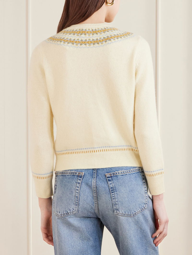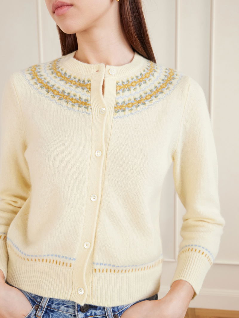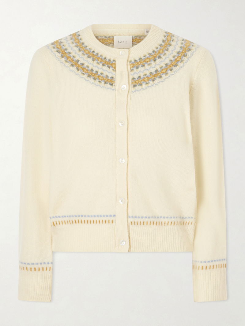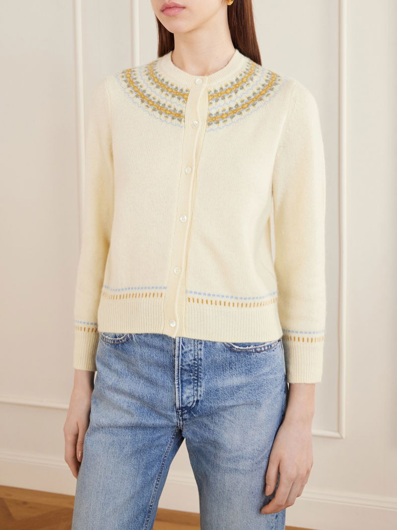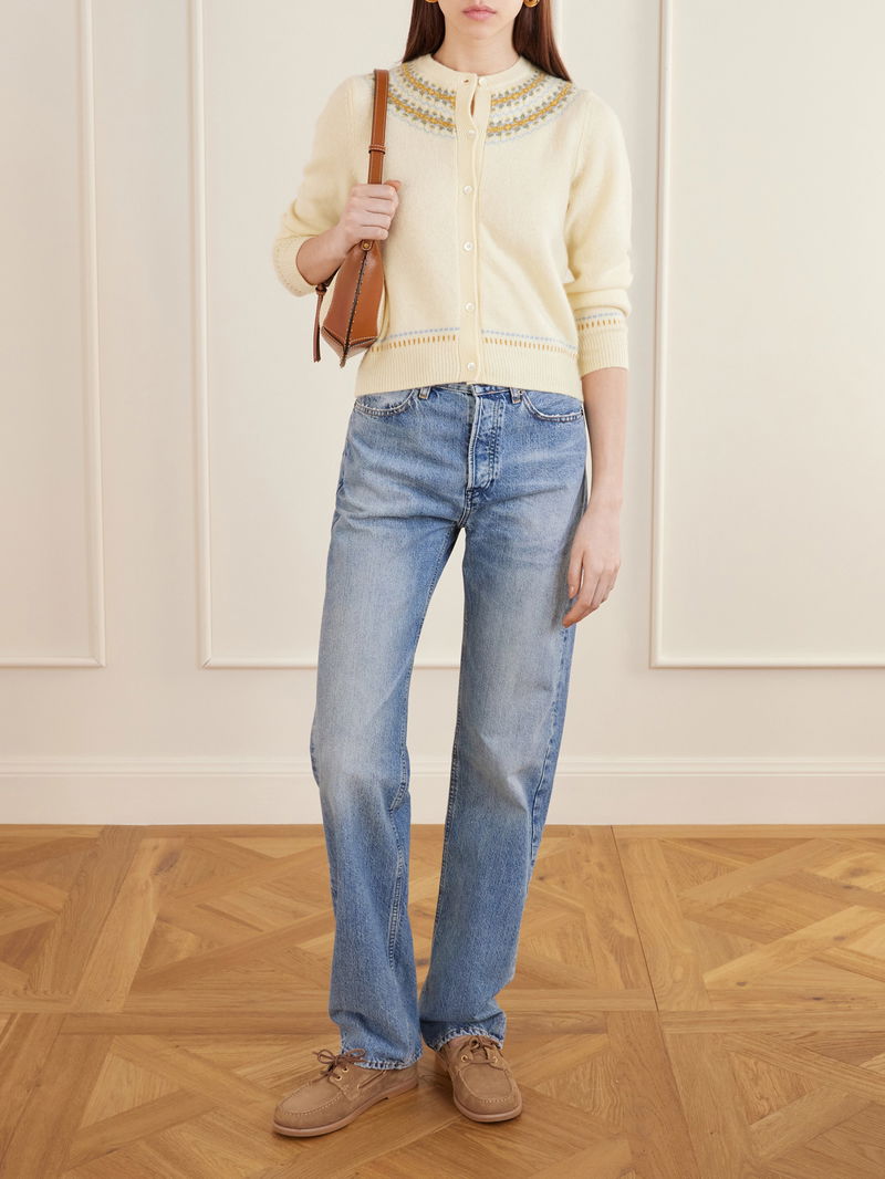 DÔEN’s ‘Olympe’ cardigan is jacquard-knitted with a delicate pattern tracing the trims. Spun from a cozy wool-blend for a relaxed shape, it’s finished with ribbed edges for subtle definition.